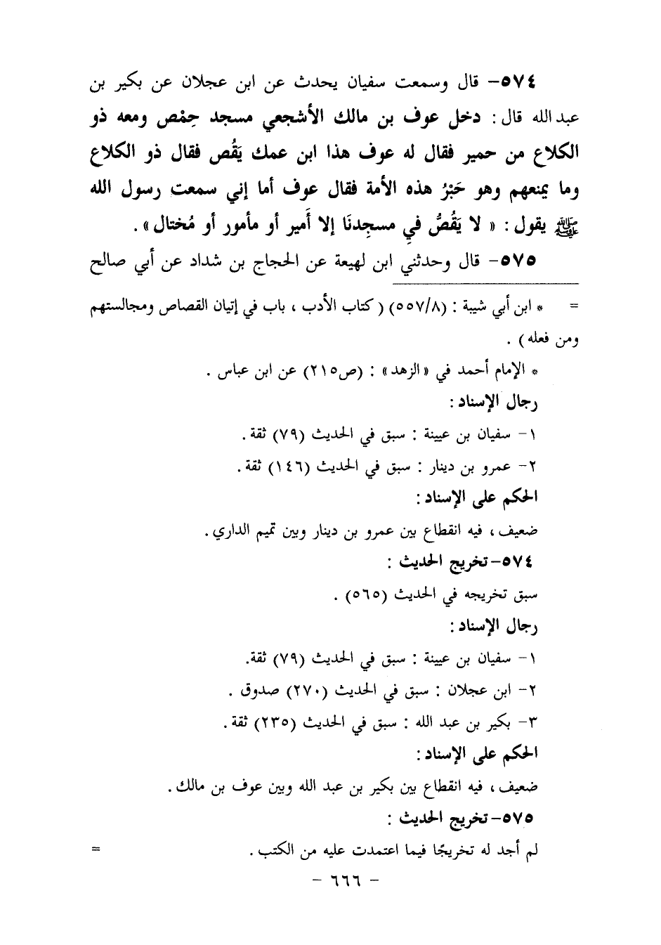 574 - وَسَمِعْتُ سُفْيَانَ، يُحَدِّثُ عَنِ ابْنِ عَجْلَانَ، عَنْ بُكَيْرِ بْنِ عَبْدِ اللَّهِ، قَالَ: دَخَلَ عَوْفُ بْنُ مَالِكٍ الْأَشْجَعِيُّ مَسْجِدَ حِمْصَ , وَمَعَهُ ذُو الْكَلَاعِ مِنْ حِمْيَرَ، فَقَالَ لَهُ عَوْفٌ: هَذَا ابْنُ عَمِّكَ يَقُصُّ، فَقَالَ ذُو الْكَلَاعِ: وَمَا يَمْنَعُهُمْ وَهُوَ حَبْرُ هَذِهِ الْأُمَّةِ فَقَالَ عَوْفٌ: أَمَا إِنِّي سَمِعْتُ رَسُولَ اللَّهِ , صَلَّى اللهُ عَلَيْهِ وَسَلَّمَ , يَقُولُ: «§لَا يَقُصُّ فِي مَسْجِدِنَا إِلَّا أَمِيرٌ، أَوْ مَأْمُورٌ، أَوْ مُخْتَالٌ»
