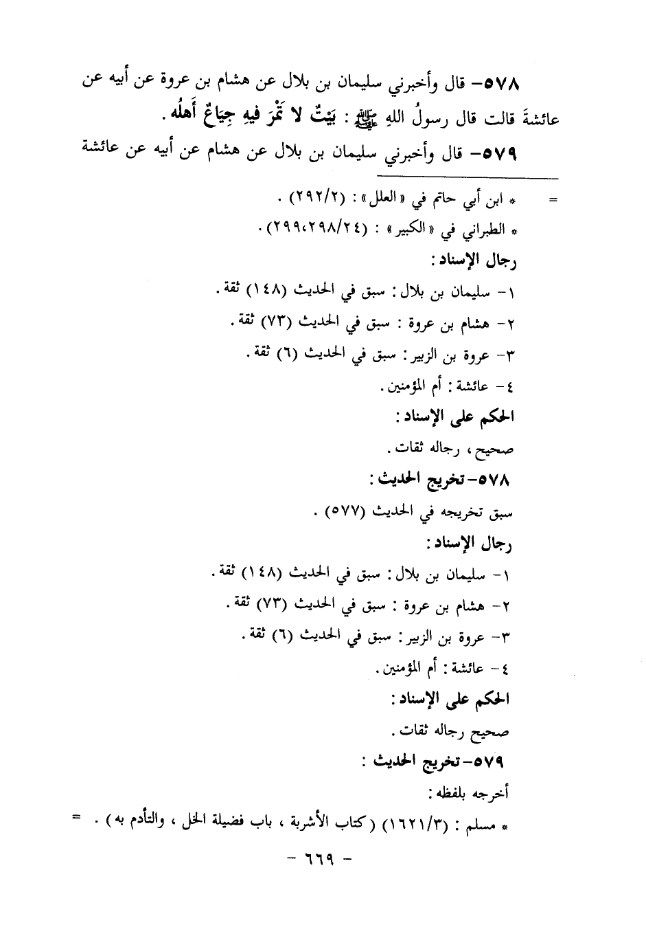 578 - وَأَخْبَرَنِي سُلَيْمَانُ بْنُ بِلَالٍ، عَنْ هِشَامِ بْنِ عُرْوَةَ، عَنْ أَبِيهِ، عَنْ عَائِشَةَ، قَالَتْ: قَالَ رَسُولُ اللَّهِ , صَلَّى اللهُ عَلَيْهِ وَسَلَّمَ: «§بَيْتٌ لَا تَمْرَ فِيهِ جِيَاعٌ أَهْلُهُ»