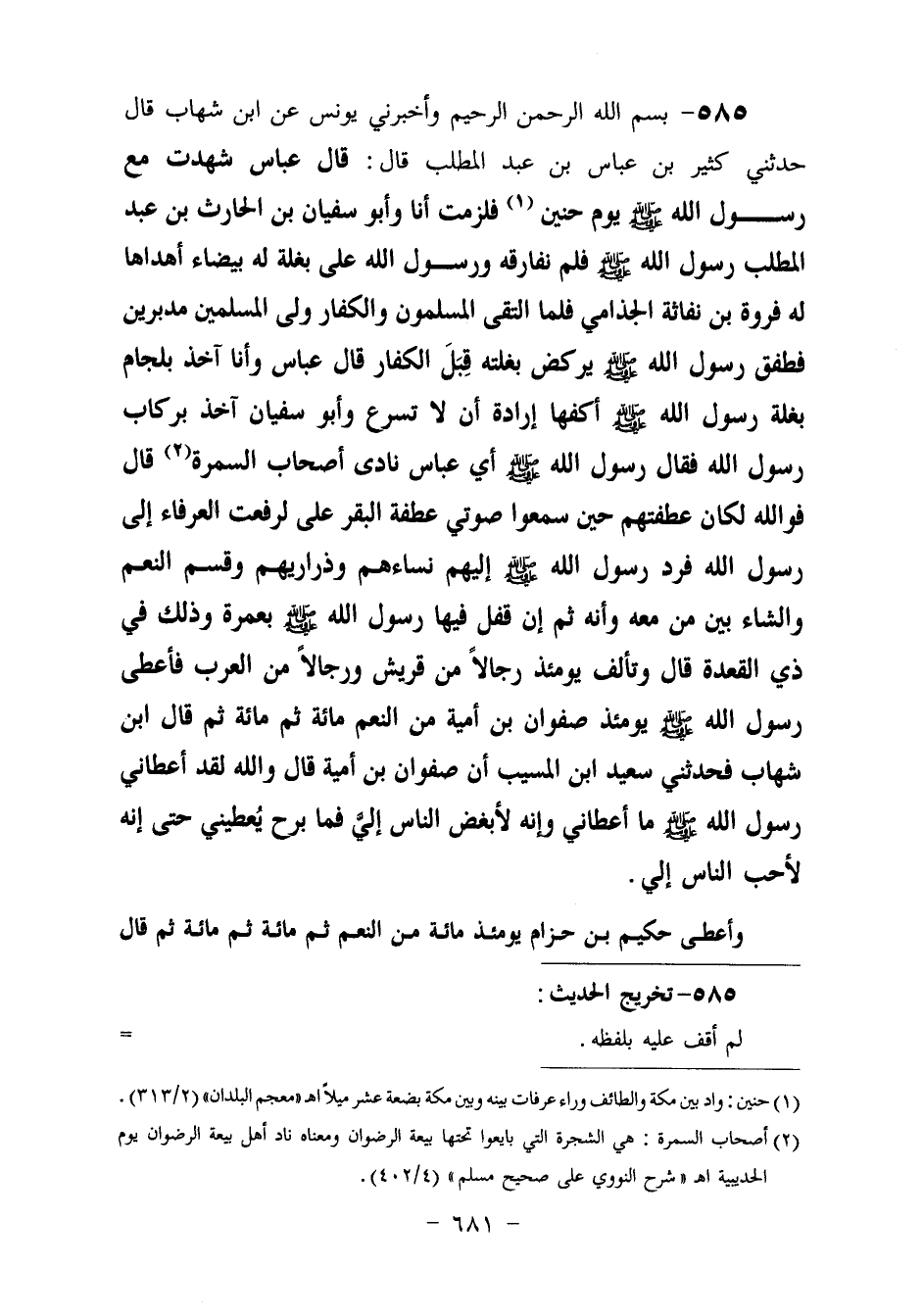 585 - بِسْمِ اللَّهِ الرَّحْمَنِ الرَّحِيمِ، وَأَخْبَرَنِي يُونُسُ، عَنِ ابْنِ شِهَابٍ، قَالَ: حَدَّثَنِي كَثِيرُ بْنُ عَبَّاسِ بْنِ عَبْدِ الْمُطَّلِبِ، قَالَ: قَالَ عَبَّاسٌ: شَهِدْتُ مَعَ رَسُولِ اللَّهِ , صَلَّى اللهُ عَلَيْهِ وَسَلَّمَ يَوْمَ حُنَيْنٍ , فَلَزِمْتُ أَنَا وَأَبُو سُفْيَانَ بْنُ الْحَارِثِ بْنِ عَبْدِ الْمُطَّلِبِ رَسُولَ اللَّهِ صَلَّى اللهُ عَلَيْهِ وَسَلَّمَ , فَلَمْ نُفَارِقْهُ، وَرَسُولُ اللَّهِ عَلَى بَغْلَةٍ لَهُ بَيْضَاءَ أَهْدَاهَا لَهُ فَرْوَةُ بْنُ نُفَاثَةَ الْجُذَامِيُّ، فَلَمَّا الْتَقَى الْمُسْلِمُونَ وَالْكُفَّارُ وَلَّى الْمُسْلِمُونَ مُدْبِرِينَ، فَطَفِقَ رَسُولُ اللَّهِ , صَلَّى اللهُ عَلَيْهِ وَسَلَّمَ , يَرْكُضُ بَغْلَتَهُ قِبَلَ الْكُفَّارِ، قَالَ عَبَّاسٌ: وَأَنَا آخِذٌ بِلِجَامِ بَغْلَةِ رَسُولِ اللَّهِ صَلَّى اللهُ عَلَيْهِ وَسَلَّمَ , أَكُفُّهَا إِرَادَةَ أَنْ لَا تُسْرِعَ وَأَبُو سُفْيَانَ آخِذٌ بِرِكَابِ رَسُولِ اللَّهِ , فَقَالَ رَسُولُ اللَّهِ صَلَّى اللهُ عَلَيْهِ وَسَلَّمَ: «أَيْ عَبَّاسُ نَادِ أَصْحَابَ السَّمُرَةِ» ، قَالَ: فَوَاللَّهِ لَكَأَنَّ عَطْفَتَهُمْ حِينَ سَمِعُوا صَوْتِي عَطْفَةُ الْبَقَرِ عَلَيَّ لَرَفَعَتِ الْعُرَفَاءُ إِلَى رَسُولِ اللَّهِ، فَرَدَّ رَسُولُ اللَّهِ صَلَّى اللهُ عَلَيْهِ وَسَلَّمَ إِلَيْهِمْ نِسَاءَهُمْ وَذَرَارِيَّهُمْ، وَقَسَّمَ النَّعَمَ، وَالشَّاءَ بَيْنَ مَنْ مَعَهُ، وَأَنَّهُ ثَمَّ إِنْ قَفَلَ فِيهَا رَسُولُ اللَّهِ صَلَّى اللهُ عَلَيْهِ وَسَلَّمَ بِعُمْرَةٍ، وَذَلِكَ فِي ذِي الْقِعْدَةِ، قَالَ: وَتَأَلَّفَ يَوْمَئِذٍ رِجَالًا مِنْ قُرَيْشٍ رِجَالًا مِنَ الْعَرَبِ، فَأَعْطَى رَسُولُ اللَّهِ صَلَّى اللهُ عَلَيْهِ وَسَلَّمَ يَوْمَئِذٍ صَفْوَانَ بْنَ أُمَيَّةَ مِنَ النَّعَمِ مِائَةً ثُمَّ مِائَةً، ثُمَّ قَالَ ابْنُ شِهَابٍ: فَحَدَّثَنِي سَعِيدُ بْنُ الْمُسَيِّبِ أَنَّ صَفْوَانَ بْنَ أُمَيَّةَ قَالَ: وَاللَّهِ لَقَدْ أَعْطَانِي رَسُولُ اللَّهِ صَلَّى اللهُ عَلَيْهِ وَسَلَّمَ مَا أَعْطَانِي، وَإِنَّهُ لَأَبْغَضُ النَّاسِ إِلَيَّ , فَمَا بَرِحَ يُعْطِينِي حَتَّى إِنَّهُ لَأَحَبُّ النَّاسِ إِلَيَّ، وَأَعْطَى حَكِيمَ بْنَ حِزَامٍ يَوْمَئِذٍ مِائَةً مِنَ النَّعَمِ، ثُمَّ مِائَةً ثُمَّ مِائَةً، ثُمَّ قَالَ -[682]- رَسُولُ اللَّهِ صَلَّى اللهُ عَلَيْهِ وَسَلَّمَ لِحَكِيمٍ: «إِنَّ §هَذَا الْمَالَ خَضِرَةٌ حُلْوَةٌ مَنْ أَخَذَهُ بِحَقِّهِ بُورِكَ لَهُ فِيهِ، وَمَنْ أَخَذَهُ بِإِشْرَافِ نَفْسٍ لَمْ يُبَارَكْ لَهُ فِيهِ، وَكَانَ كَالَّذِي يَأْكُلُ وَلَا يَشْبَعُ، وَالْيَدُ الْعُلْيَا خَيْرٌ مِنَ الْيَدِ السُّفْلَى» . . . . . . رَسُولُ اللَّهِ صَلَّى اللهُ عَلَيْهِ وَسَلَّمَ يَوْمَئِذٍ رحران مِائَةً مِنَ الْإِبِلِ، وَأَعْطَى الْأَقْرَعَ بْنَ حَابِسٍ مِائَةً مِنَ الْإِبِلِ، وَأَعْطَى فَقَالَ رَسُولُ اللَّهِ: «لَكَ إِلَى الْمَدِينَةِ» حَتَّى إِذَا قَدِمْنَا أَمَّرَ أَبَا بَكْرٍ الصِّدِّيقَ عَلَى الْحَجِّ