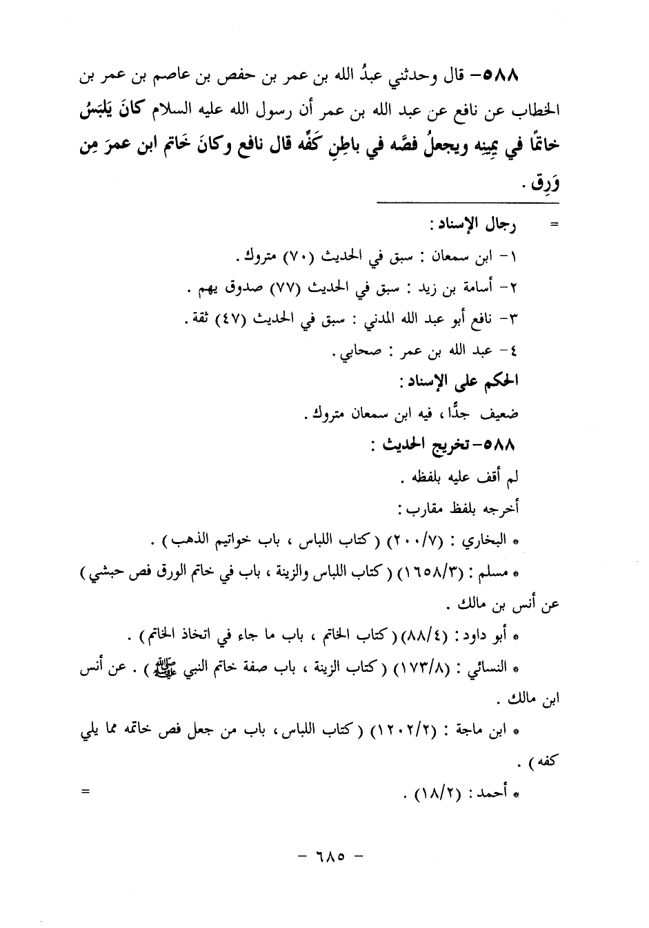588 - وَحَدَّثَنِي عَبْدُ اللَّهِ بْنُ عُمَرَ بْنِ حَفْصِ بْنِ عَاصِمِ بْنِ عُمَرَ بْنِ الْخَطَّابِ، عَنْ نَافِعٍ، عَنْ عَبْدِ اللَّهِ بْنِ عُمَرَ، أَنَّ رَسُولَ اللَّهِ عَلَيْهِ السَّلَامُ «كَانَ §يَلْبَسُ خَاتَمًا فِي يَمِينِهِ , وَيَجْعَلُ فَصَّهُ فِي بَاطِنِ كَفِّهِ» قَالَ نَافِعٌ: وَكَانَ خَاتَمُ ابْنِ عُمَرَ مِنْ وَرِقٍ