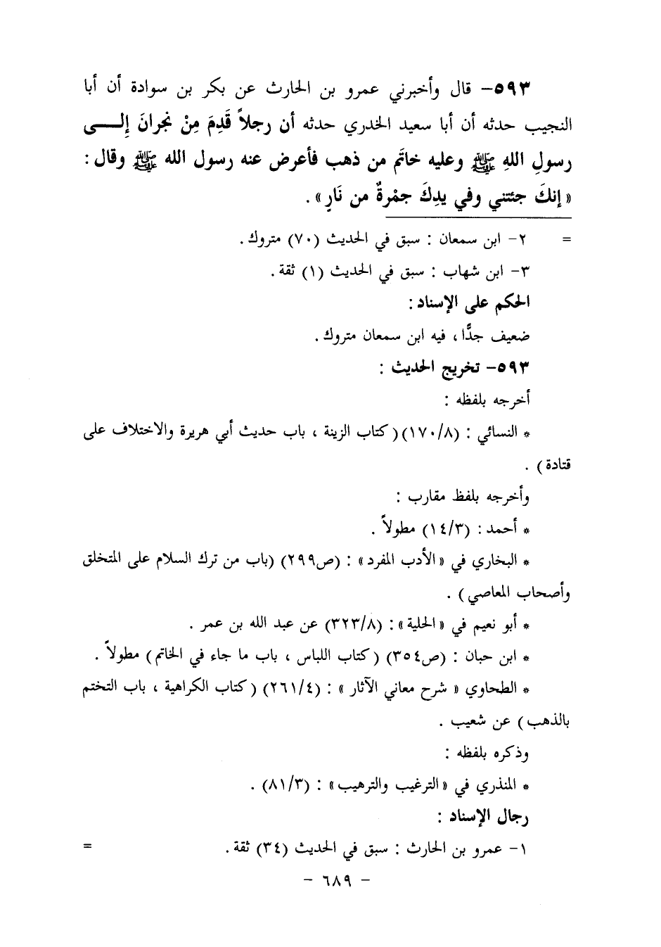 593 - وَأَخْبَرَنِي عَمْرُو بْنُ الْحَارِثِ، عَنْ بَكْرِ بْنِ سَوَادَةَ، أَنَّ أَبَا النَّجِيبِ حَدَّثَهُ، أَنَّ أَبَا سَعِيدٍ الْخُدْرِيَّ حَدَّثَهُ أَنَّ رَجُلًا قَدِمَ مِنْ نَجْرَانَ إِلَى رَسُولِ اللَّهِ صَلَّى اللهُ عَلَيْهِ وَسَلَّمَ , وَعَلَيْهِ خَاتَمٌ مِنْ ذَهَبٍ، فَأَعْرَضَ عَنْهُ رَسُولُ اللَّهِ صَلَّى اللهُ عَلَيْهِ وَسَلَّمَ , وَقَالَ: «إِنَّكَ §جِئْتَنِي وَفِي يَدِكَ جَمْرَةٌ مِنْ نَارٍ»
