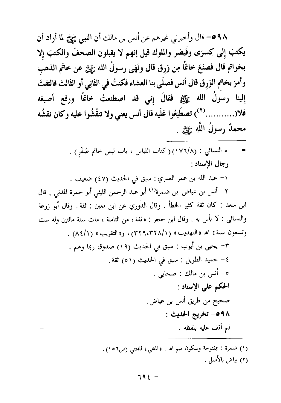 598 - وَأَخْبَرَنِي غَيْرُهُمْ عَنْ أَنَسِ بْنِ مَالِكٍ أَنَّ النَّبِيَّ صَلَّى اللهُ عَلَيْهِ وَسَلَّمَ لَمَّا أَرَادَ أَنْ يَكْتُبَ إِلَى كِسْرَى، وَقَيْصَرَ وَالْمُلُوكِ، قِيلَ: إِنَّهُمْ لَا يَقْبَلُونَ الصُّحُفَ وَالْكُتُبَ إِلَّا بِخَوِاتِمَ، قَالَ: §فَصَنَعَ خَاتَمًا مِنْ وَرِقٍ، قَالَ: وَنَهَى رَسُولُ اللَّهِ , صَلَّى اللهُ عَلَيْهِ وَسَلَّمَ عَنْ خَاتَمِ الذَّهَبِ، وَأَمَرَ بِخَاتَمِ الْوَرِقِ، قَالَ أَنَسٌ: فَصَلَّى بِنَا الْعِشَاءَ، فَكُنْتُ فِي الثَّانِي أَوِ الثَّالِثِ , فَالْتَفَتَ إِلَيْنَا رَسُولُ اللَّهِ صَلَّى اللهُ عَلَيْهِ وَسَلَّمَ , فَقَالَ: «إِنِّي قَدِ اصْطَنَعْتُ خَاتَمًا , وَرَفَعَ أُصْبُعَهُ فَلَا. . . تَصْطَنِعُوا عَلَيْهِ» ، قَالَ أَنَسٌ: يَعْنِي: وَلَا تَنْقُشُوا عَلَيْهِ، وَكَانَ نَقْشُهُ: مُحَمَّدٌ رَسُولُ اللَّهِ صَلَّى اللهُ عَلَيْهِ وَسَلَّمَ