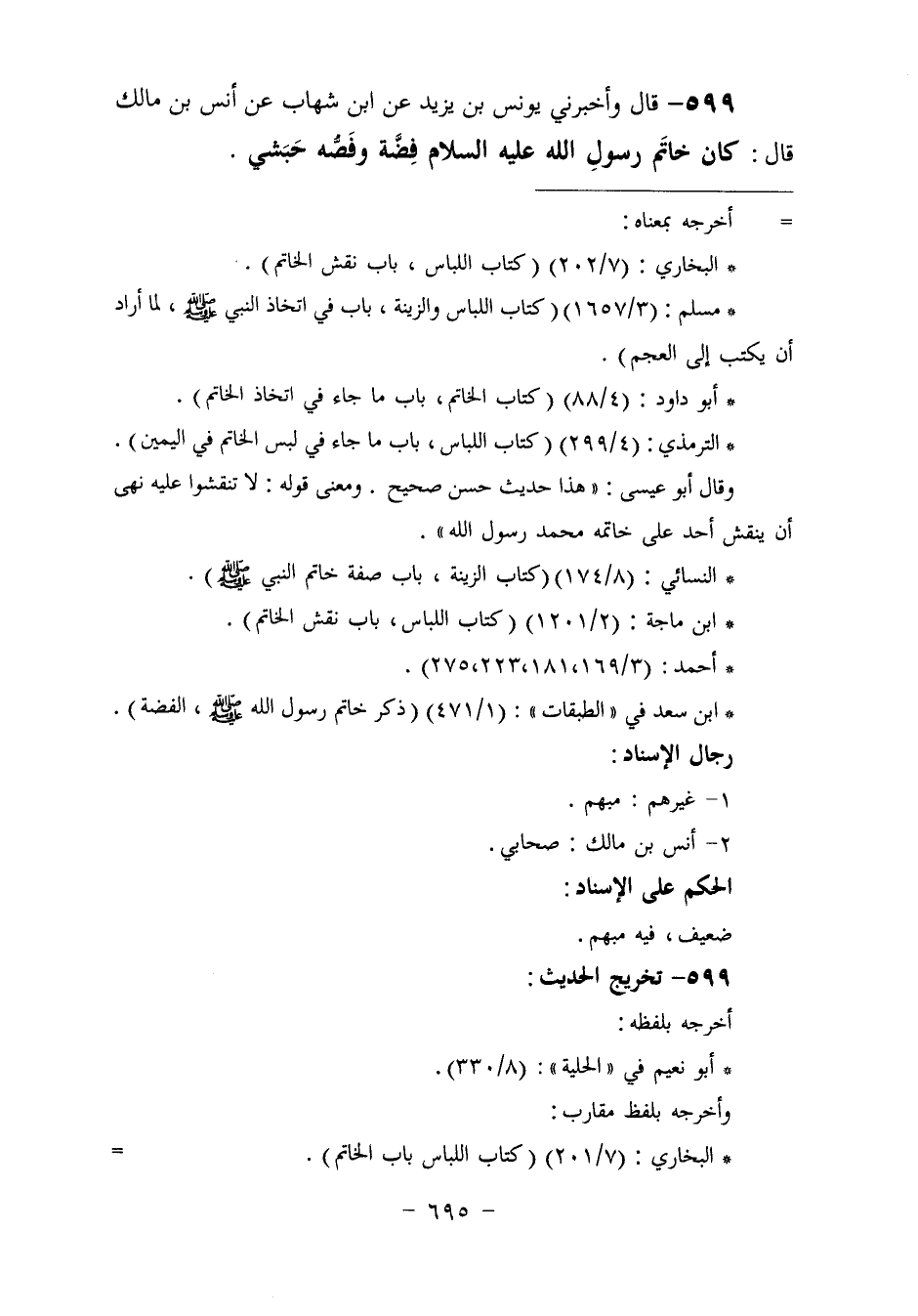 599 - وَأَخْبَرَنِي يُونُسُ بْنُ يَزِيدَ، عَنِ ابْنِ شِهَابٍ، عَنْ أَنَسِ بْنِ مَالِكٍ، قَالَ: «كَانَ §خَاتَمُ رَسُولِ اللَّهِ عَلَيْهِ السَّلَامُ فِضَّةً، وَفَصُّهُ حَبَشِيٌّ»