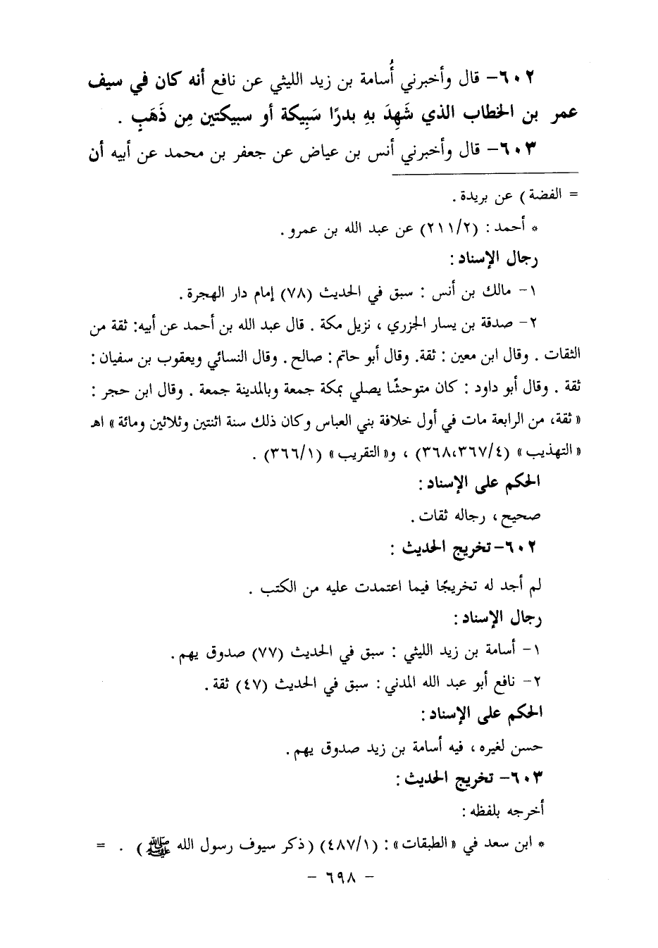 602 - وَأَخْبَرَنِي أُسَامَةُ بْنُ زَيْدٍ اللَّيْثِيُّ، عَنْ نَافِعٍ، «أَنَّهُ §كَانَ فِي سَيْفِ عُمَرَ بْنِ الْخَطَّابِ الَّذِي شَهِدَ بِهِ بَدْرًا سَبِيكَةٌ أَوْ سَبِيكَتَانِ مِنْ ذَهَبٍ»