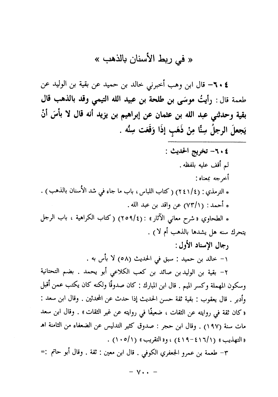 604 - أَخْبَرَنِي خَالِدُ بْنُ حُمَيْدٍ، عَنْ بَقِيَّةَ بْنِ الْوَلِيدِ، عَنْ طُعْمَةَ، قَالَ: «§رَأَيْتُ مُوسَى بْنَ طَلْحَةَ بْنِ عُبَيْدِ اللَّهِ التَّيْمِيَّ وَقَدْ. . . بِالذَّهَبِ»