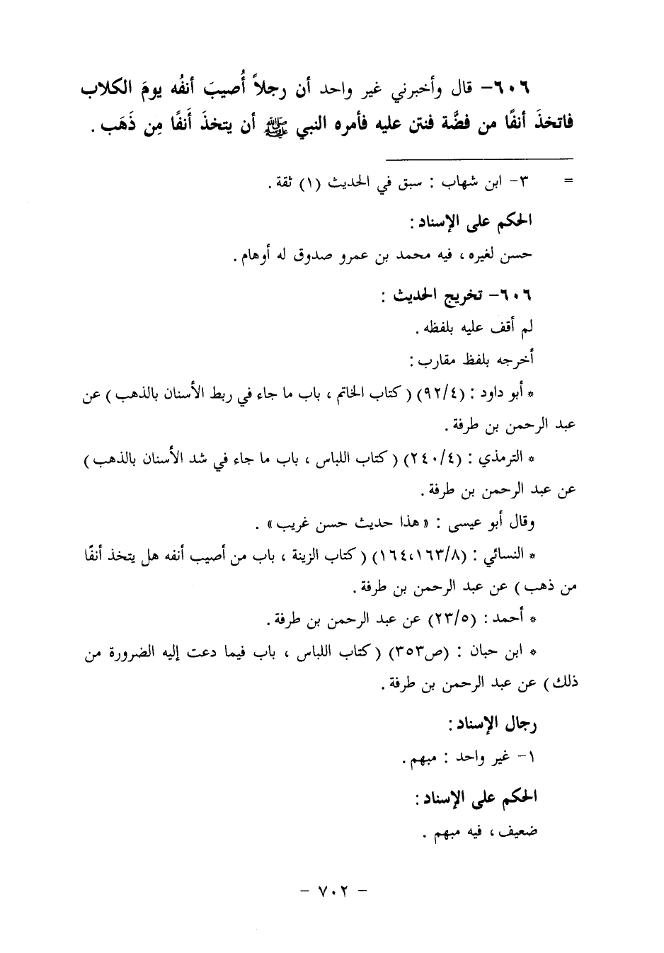 606 - وَأَخْبَرَنِي غَيْرُ وَاحِدٍ، أَنَّ رَجُلًا أُصِيبَ أَنْفُهُ يَوْمَ الْكُلَابِ فَاتَّخَذَ أَنْفًا مِنْ فِضَّةٍ، فَنَتِنَ عَلَيْهِ، «§فَأَمَرَهُ النَّبِيُّ صَلَّى اللهُ عَلَيْهِ وَسَلَّمَ أَنْ يَتَّخِذَ أَنْفًا مِنْ ذَهَبٍ»