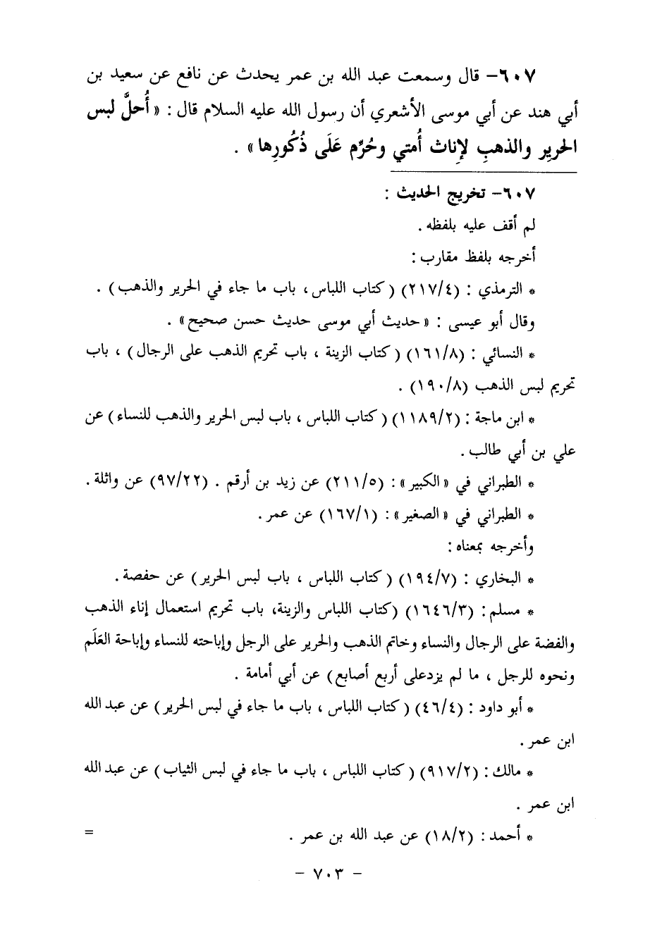 607 - وَسَمِعْتُ عَبْدَ اللَّهِ بْنَ عُمَرَ، يُحَدِّثُ عَنْ نَافِعٍ، عَنْ سَعِيدِ بْنِ أَبِي هِنْدٍ، عَنْ أَبِي مُوسَى الْأَشْعَرِيِّ، أَنَّ رَسُولَ اللَّهِ عَلَيْهِ السَّلَامُ قَالَ: «§أُحِلَّ لُبْسُ الْحَرِيرِ وَالذَّهَبِ لِإِنَاثِ أُمَّتِي، وَحُرِّمَ عَلَى ذُكُورِهَا»
