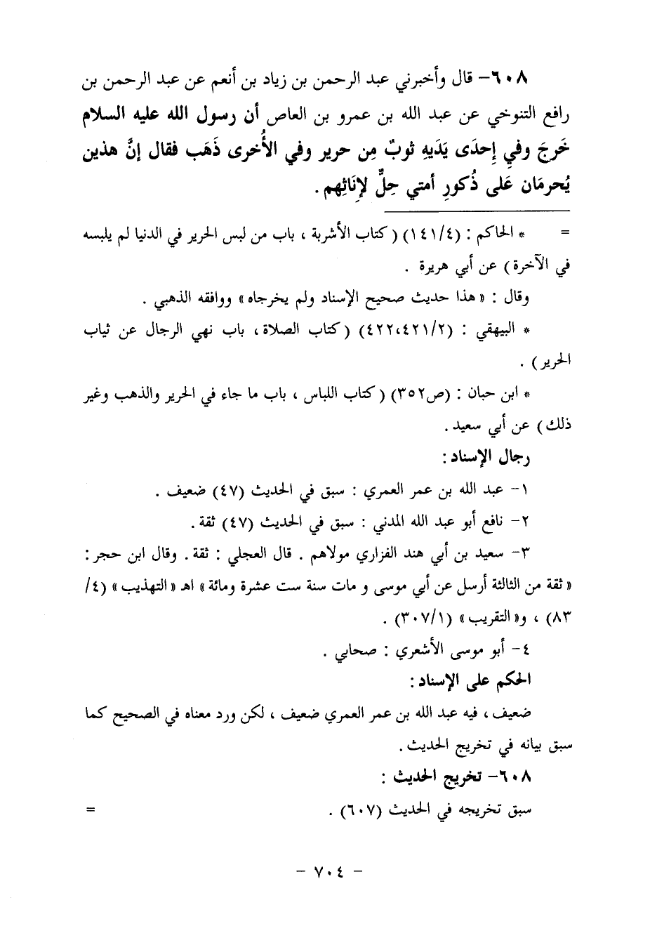 608 - وَأَخْبَرَنِي عَبْدُ الرَّحْمَنِ بْنُ زِيَادِ بْنِ أَنْعَمَ، عَنْ عَبْدِ الرَّحْمَنِ بْنِ رَافِعٍ التَّنُوخِيِّ، عَنْ عَبْدِ اللَّهِ بْنِ عَمْرِو بْنِ الْعَاصِ، أَنَّ رَسُولَ اللَّهِ عَلَيْهِ السَّلَامُ خَرَجَ وَفِي إِحْدَى يَدَيْهِ ثَوْبٌ مِنْ حَرِيرٍ، وَفِي الْأُخْرَى ذَهَبٌ، فَقَالَ: «إِنَّ §هَذَيْنِ يَحْرُمَانِ عَلَى ذُكُورِ أُمَّتِي، حِلٌّ لِإِنَاثِهِمْ»