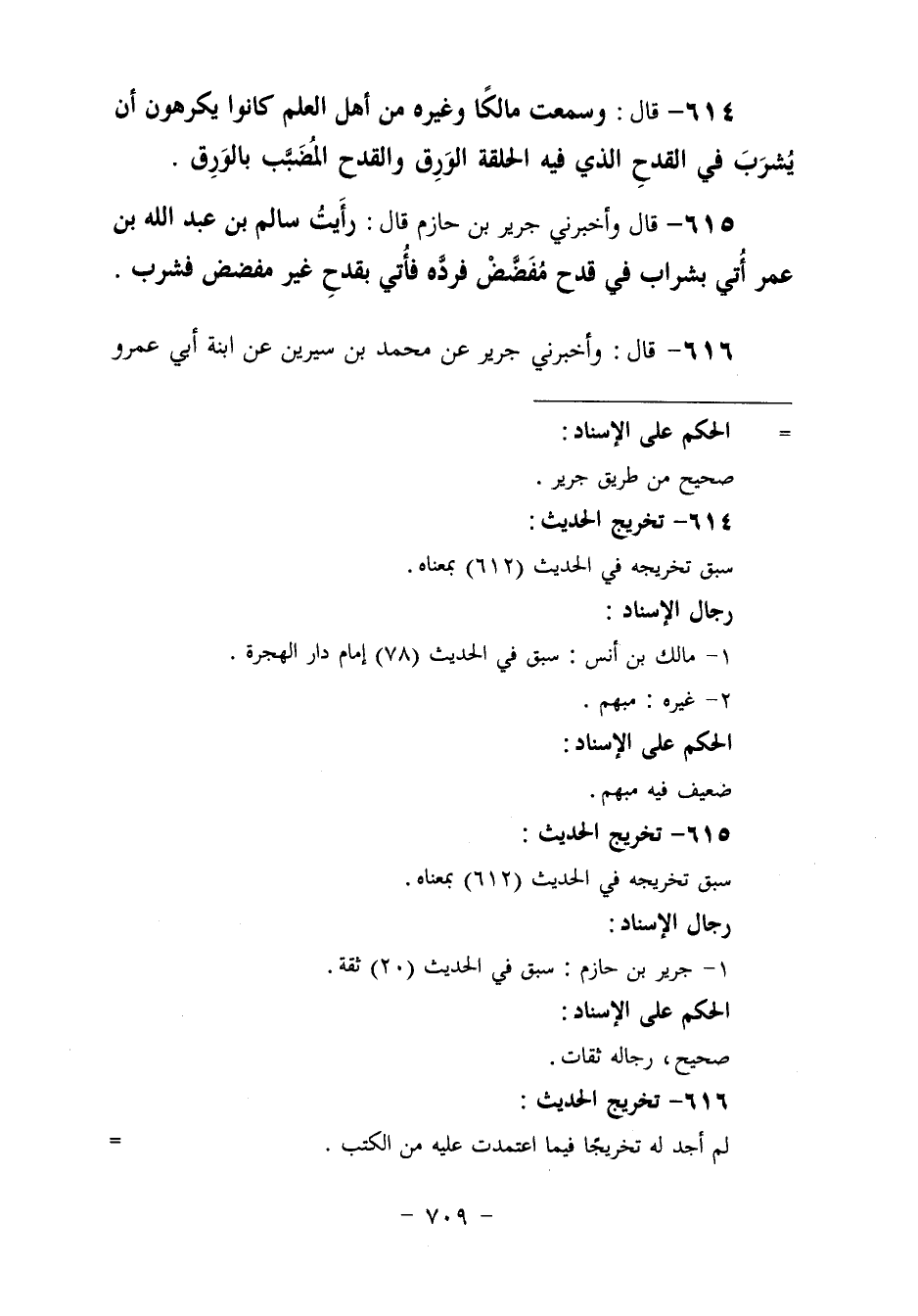615 - وَأَخْبَرَنِي جَرِيرُ بْنُ حَازِمٍ، قَالَ: رَأَيْتُ سَالِمَ بْنَ عَبْدِ اللَّهِ بْنِ عُمَرَ، «§أُتِيَ بِشَرَابٍ فِي قَدَحٍ مُفَضَّضٍ فَرَدَّهُ، فَأُتِيَ بِقَدَحٍ غَيْرَ مُفَضَّضٍ فَشَرِبَ»
