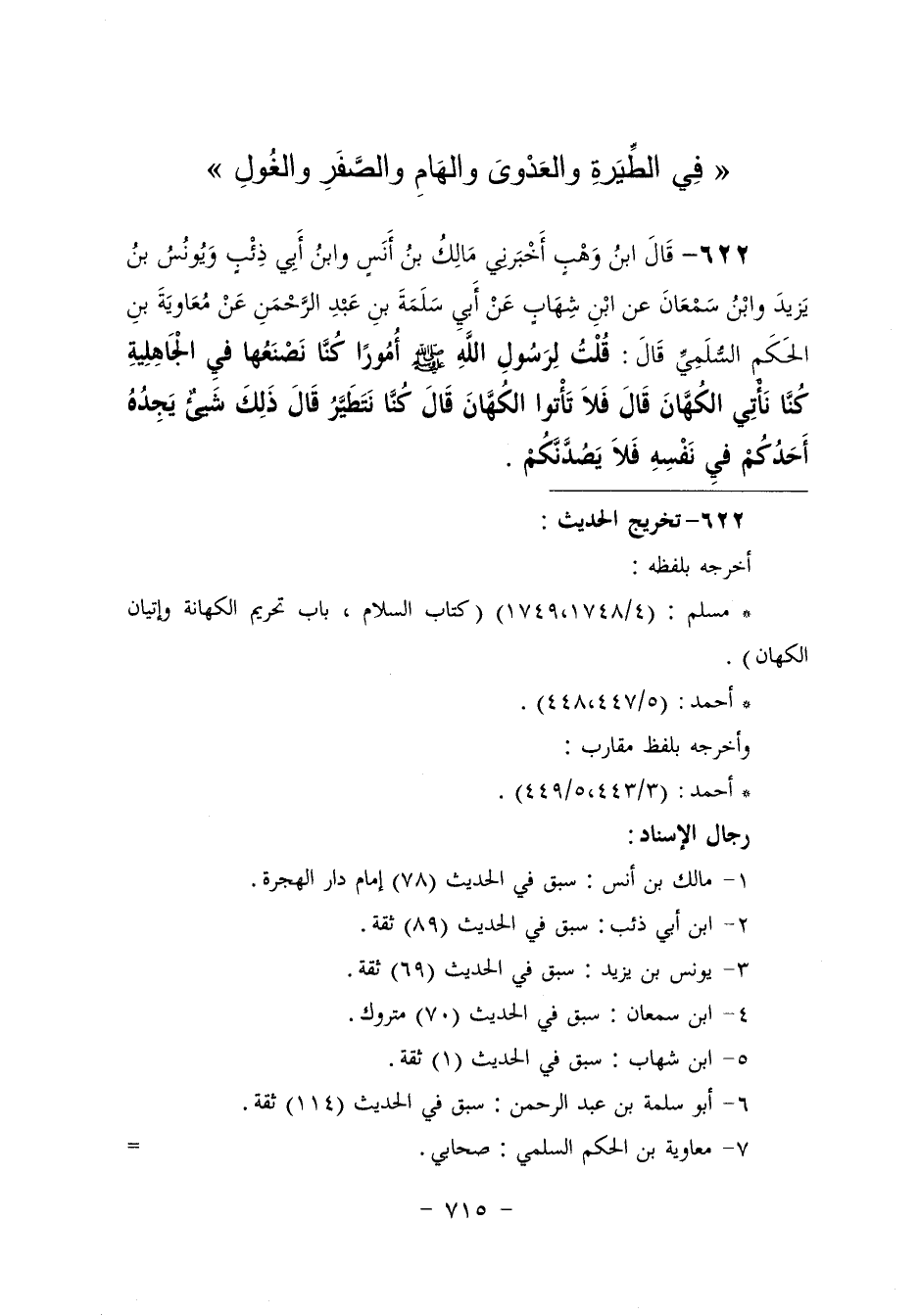 622 - أَخْبَرَنِي مَالِكُ بْنُ أَنَسٍ، وَابْنُ أَبِي ذِئْبٍ، وَيُونُسُ بْنُ يَزِيدَ، وَابْنُ سَمْعَانَ، عَنِ ابْنِ شِهَابٍ، عَنْ أَبِي سَلَمَةَ بْنِ عَبْدِ الرَّحْمَنِ، عَنْ مُعَاوِيَةَ بْنِ الْحَكَمِ السُّلَمِيِّ، قَالَ: قُلْتُ لِرَسُولِ اللَّهِ صَلَّى اللهُ عَلَيْهِ وَسَلَّمَ , أُمُورًا كُنَّا نَصْنَعُهَا فِي الْجَاهِلِيَّةِ: كُنَّا نَأْتِي الْكُهَّانَ، قَالَ: «§فَلَا تَأْتُوا الْكُهَّانَ» ، قَالَ: كُنَّا نَتَطَيَّرُ. قَالَ: «ذَلِكَ شَيْءٌ يَجِدُهُ أَحَدُكُمْ فِي نَفْسِهِ فَلَا يَصُدَّنَّكُمْ»