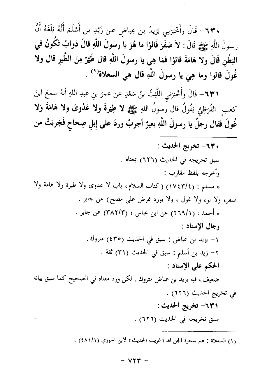630 - وَأَخْبَرَنِي يَزِيدُ بْنُ عِيَاضٍ، عَنْ زَيْدِ بْنِ أَسْلَمَ، أَنَّهُ بَلَغَهُ أَنَّ رَسُولَ اللَّهِ صَلَّى اللهُ عَلَيْهِ وَسَلَّمَ , قَالَ: «§لَا صَفَرَ» ، قَالُوا: مَا هُوَ يَا رَسُولَ اللَّهِ؟ قَالَ: «دَوَابٌّ تَكُونُ فِي الْبَطْنِ» ، قَالَ: «ولَا هَامَةَ» ، قَالُوا: فمَا هِيَ يَا رَسُولَ اللَّهِ؟، قَالَ: «طَيْرٌ مِنَ الطَّيْرِ» ، قَالَ: «وَلَا غُولَ» ، قَالُوا: وَمَا هِيَ يَا رَسُولَ اللَّهِ؟، قَالَ: «هِيَ السِّعْلَاةُ»