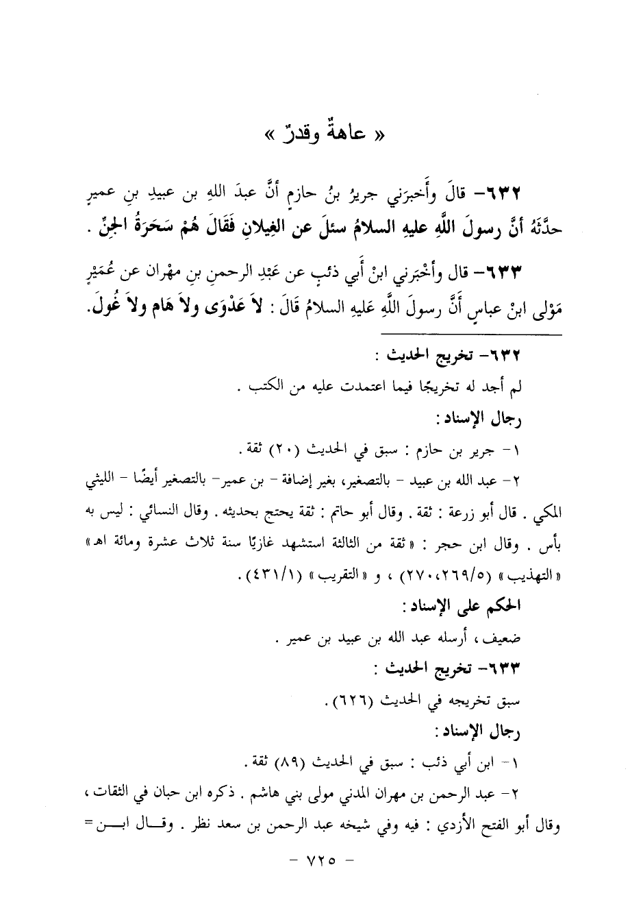 632 - وَأَخْبَرَنِي جَرِيرُ بْنُ حَازِمٍ، أَنَّ عَبْدَ اللَّهِ بْنَ عُبَيْدِ بْنِ عُمَيْرٍ، حَدَّثَهُ أَنَّ رَسُولَ اللَّهِ عَلَيْهِ السَّلَامُ , سُئِلَ عَنِ الْغِيلَانِ، فَقَالَ: «§هُمْ سَحَرَةُ الْجِنِّ»