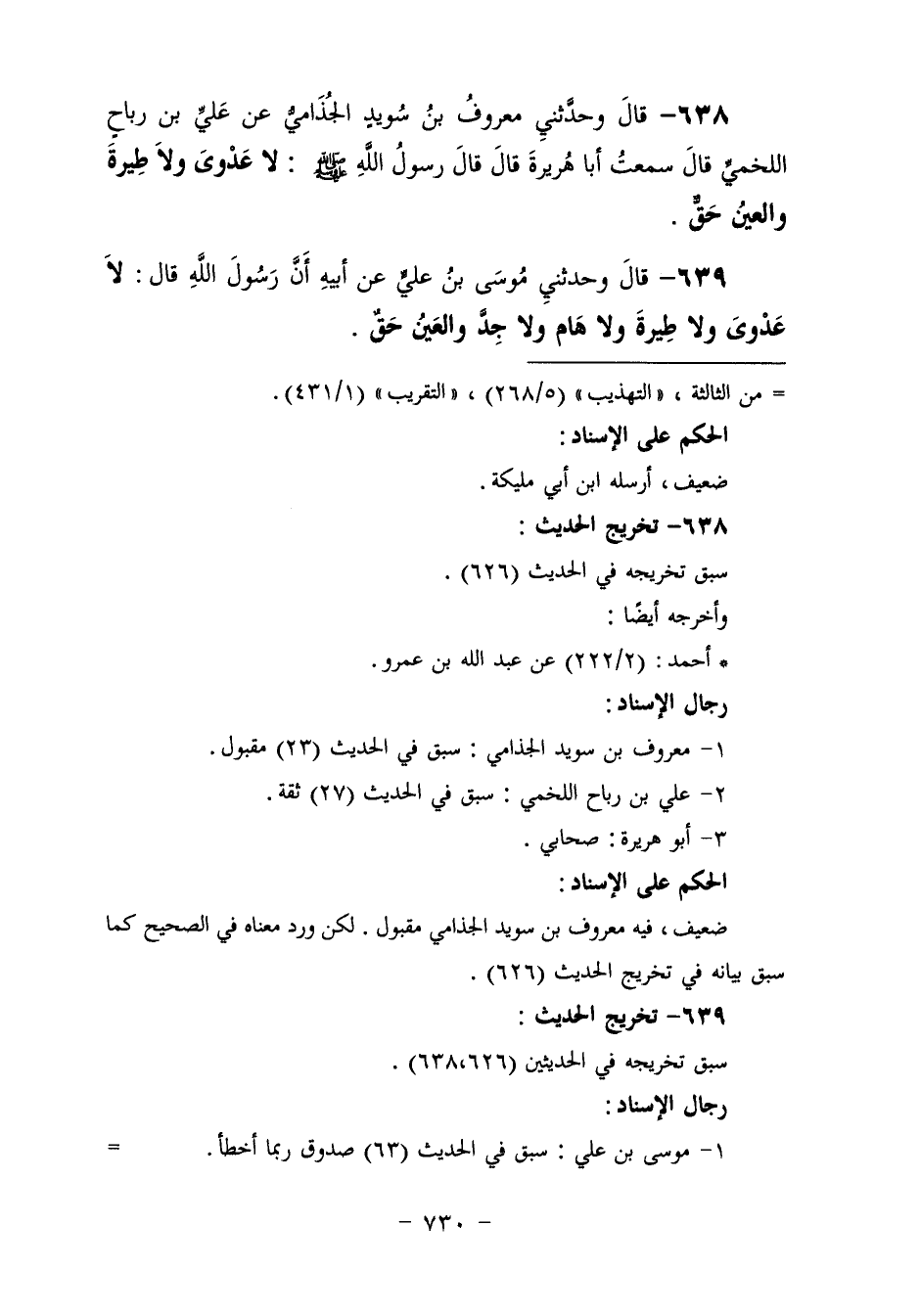 638 - وَحَدَّثَنِي مَعْرُوفُ بْنُ سُوَيْدٍ الْجُذَامِيُّ، عَنْ عَلِيِّ بْنِ رَبَاحٍ اللَّخْمِيِّ، قَالَ: سَمِعْتُ أَبَا هُرَيْرَةَ، قَالَ: قَالَ رَسُولُ اللَّهِ صَلَّى اللهُ عَلَيْهِ وَسَلَّمَ: «§لَا عَدْوَى، وَلَا طِيَرَةَ , وَالْعَيْنُ حَقٌّ»