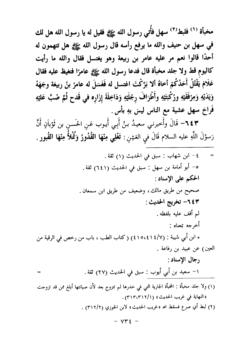 643 - وَأَخْبَرَنِي سَعِيدُ بْنُ أَبِي أَيُّوبَ، عَنِ الْحَسَنِ بْنِ ثَوْبَانَ، أَنَّ رَسُولَ اللَّهِ عَلَيْهِ السَّلَامُ , قَالَ فِي §الْعَيْنِ: «تَغْلِي مِنْهَا الْقُدُورُ، وَتُمْلَأُ مِنْهَا الْقُبُورُ»