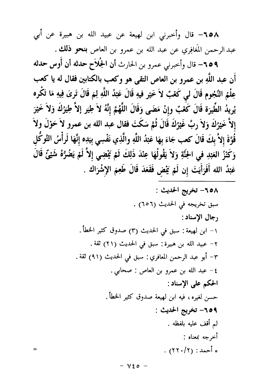 659 - وَأَخْبَرَنِي عَمْرُو بْنُ الْحَارِثِ، أَنَّ الْجُلَاحَ، حَدَّثَهُ، أَنَّ أَوْسًا حَدَّثَهُ، أَنَّ عَبْدَ اللَّهِ بْنَ عَمْرِو بْنِ الْعَاصِ، الْتَقَى هُوَ وَكَعْبٌ، بِالْكِتَابَيْنِ، فَقَالَ لَهُ: يَا كَعْبُ , عِلْمُ النُّجُومِ؟ قَالَ لَهُ كَعْبٌ: لَا خَيْرَ فِيهِ، قَالَ عَبْدُ اللَّهِ: لِمَ؟ قَالَ: تَرَى فِيهِ مَا تَكْرَهُ , يُرِيدُ الطِّيَرَةَ، قَالَ كَعْبٌ: وَإِنْ مَضَى، وَقَالَ: «§اللَّهُمَّ إِنَّهُ لَا طَيْرَ إِلَّا طَيْرُكَ، وَلَا خَيْرَ إِلَّا خَيْرُكَ، وَلَا رَبَّ غَيْرُكَ» ، قَالَ: ثُمَّ سَكَتَ، فَقَالَ عَبْدُ اللَّهِ بْنُ عَمْرٍو: لَا حَوْلَ وَلَا قُوَّةَ إِلَّا بِكَ، قَالَ كَعْبٌ: جَاءَ بِهَا عَبْدُ اللَّهِ , وَالَّذِي نَفْسِي بِيَدِهِ إِنَّهَا لِرَأْسُ التَّوَكُّلِ وَكَنْزُ الْعَبْدِ فِي الْجَنَّةِ، وَلَا يَقُولُهَا عِنْدَ ذَلِكَ ثُمَّ يَمْضِي إِلَّا لَمْ يَضُرَّهُ شَيْءٌ، قَالَ عَبْدُ اللَّهِ: أَفَرَأَيْتَ إِنْ لَمْ يَمْضِ فَقَعَدَ؟ قَالَ: طَعِمَ الْإِشْرَاكَ