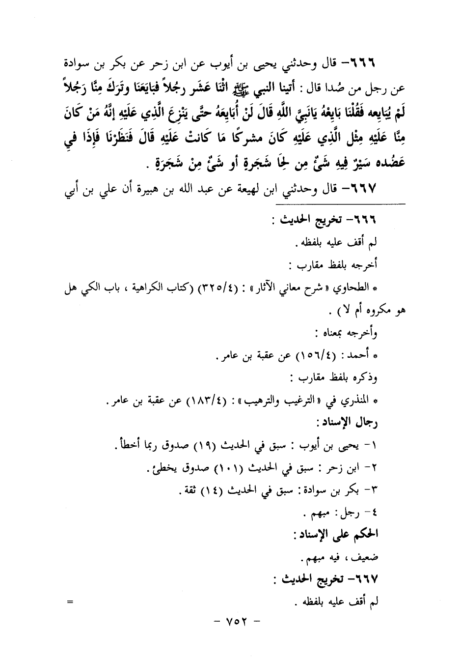 666 - وَحَدَّثَنِي يَحْيَى بْنُ أَيُّوبَ، عَنِ ابْنِ زَحْرٍ، عَنْ بَكْرِ بْنِ سَوَادَةَ، عَنْ رَجُلٍ مِنْ صُدًا، قَالَ: أَتَيْنَا النَّبِيَّ , صَلَّى اللهُ عَلَيْهِ وَسَلَّمَ , اثْنَا عَشَرَ رَجُلًا فَبَايَعْنَا وَتَرَكَ مِنَّا رَجُلًا لَمْ يُبَايِعْهُ، فَقُلْنَا: بَايِعْهُ يَا نَبِيَّ اللَّهِ، قَالَ: «§لَنْ أُبَايِعَهُ حَتَّى يَنْزِعَ الَّذِي عَلَيْهِ؛ إِنَّهُ مَنْ كَانَ مِنَّا عَلَيْهِ مِثْلَ الَّذِي عَلَيْهِ كَانَ مُشْرِكًا، مَا كَانَتْ عَلَيْهِ» قَالَ: فَنَظَرْنَا فَإِذَا فِي عَضُدِهِ سَيْرٌ فِيهِ شَيْءٌ مِنْ لِحَا شَجَرَةٍ، أَوْ شَيْءٌ مِنْ شَجَرَةٍ