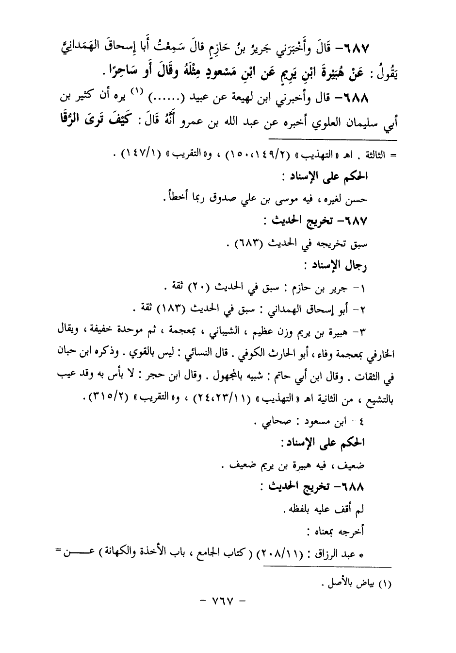 688 - وَأَخْبَرَنِي ابْنُ لَهِيعَةَ، عَنْ عُبَيْدِ. . . . . . يَرَهُ أَنَّ كَثِيرَ بْنَ أَبِي سُلَيْمَانَ الْعَلَوِيَّ أَخْبَرَهُ، عَنْ عَبْدِ اللَّهِ بْنِ عَمْرٍو، أَنَّهُ قَالَ: «§كَيْفَ تَرَى الرُّقَى -[768]-، وَالْأُخَذَةَ، وَالْكَهَانَةَ، وَنَظَرًا فِي النُّجُومِ؟ . . . . طَرَفٌ مِنَ السِّحْرِ»