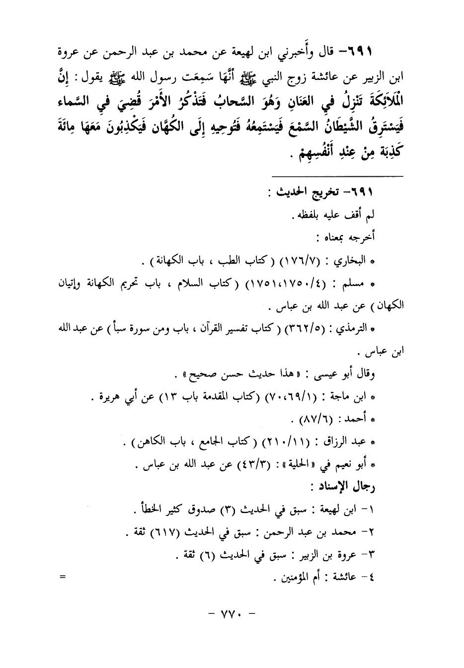 691 - وَأَخْبَرَنِي ابْنُ لَهِيعَةَ، عَنْ مُحَمَّدِ بْنِ عَبْدِ الرَّحْمَنِ، عَنْ عُرْوَةَ بْنِ الزُّبَيْرِ، عَنْ عَائِشَةَ، زَوْجِ النَّبِيِّ صَلَّى اللهُ عَلَيْهِ وَسَلَّمَ , أَنَّهَا سَمِعَتْ رَسُولَ اللَّهِ صَلَّى اللهُ عَلَيْهِ وَسَلَّمَ , يَقُولُ: «إِنَّ §الْمَلَائِكَةَ تَنْزِلُ فِي الْعَنَانِ , وَهُوَ السَّحَابُ، فَتَذْكُرُ الْأَمْرَ قُضِيَ فِي السَّمَاءِ فَيَسْتَرِقُ الشَّيْطَانُ السَّمْعَ، فَيَسْتمَعُهُ، فَتُوحِيهِ إِلَى الْكُهَّانِ فَيَكْذِبُونَ مَعَهَا مِائَةَ كِذْبَةٍ مِنْ عِنْدِ أَنْفُسِهِمْ»