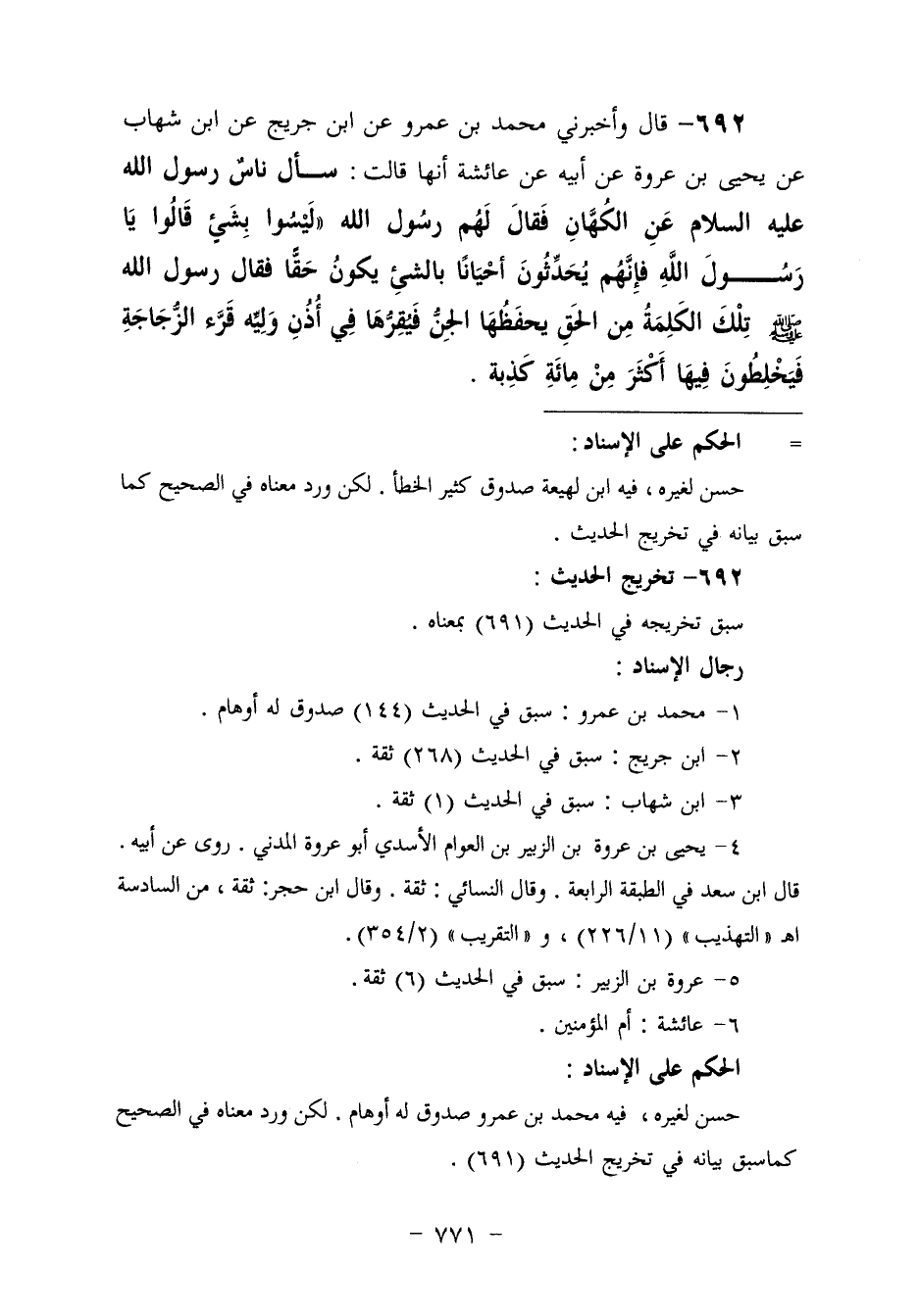 692 - وَأَخْبَرَنِي مُحَمَّدُ بْنُ عَمْرٍو، عَنِ ابْنِ جُرَيْجٍ، عَنِ ابْنِ شِهَابٍ، عَنْ يَحْيَى بْنِ عُرْوَةَ، عَنْ أَبِيهِ، عَنْ عَائِشَةَ، أَنَّهَا قَالَتْ: سَأَلَ نَاسٌ رَسُولَ اللَّهِ عَلَيْهِ السَّلَامُ عَنِ الْكُهَّانِ، فَقَالَ لَهُمْ رَسُولُ اللَّهِ: «لَيْسُوا بِشَيْءٍ» ، قَالُوا: يَا رَسُولَ اللَّهِ فَإِنَّهُمْ يُحَدِّثُونَ أَحْيَانًا بِالشَّيْءِ يَكُونُ حَقًّا، فَقَالَ رَسُولُ اللَّهِ صَلَّى اللهُ عَلَيْهِ وَسَلَّمَ: «§تِلْكَ الْكَلِمَةُ مِنَ الْحَقِّ، يَحْفَظُهَا الْجِنُّ، فَيُقِرُّهَا فِي أُذُنِ وَلِيِّهِ قَرَّ الزُّجَاجَةِ، فَيَخْلِطُونَ فِيهَا أَكْثَرَ مِنْ مِائَةِ كِذْبَةٍ»