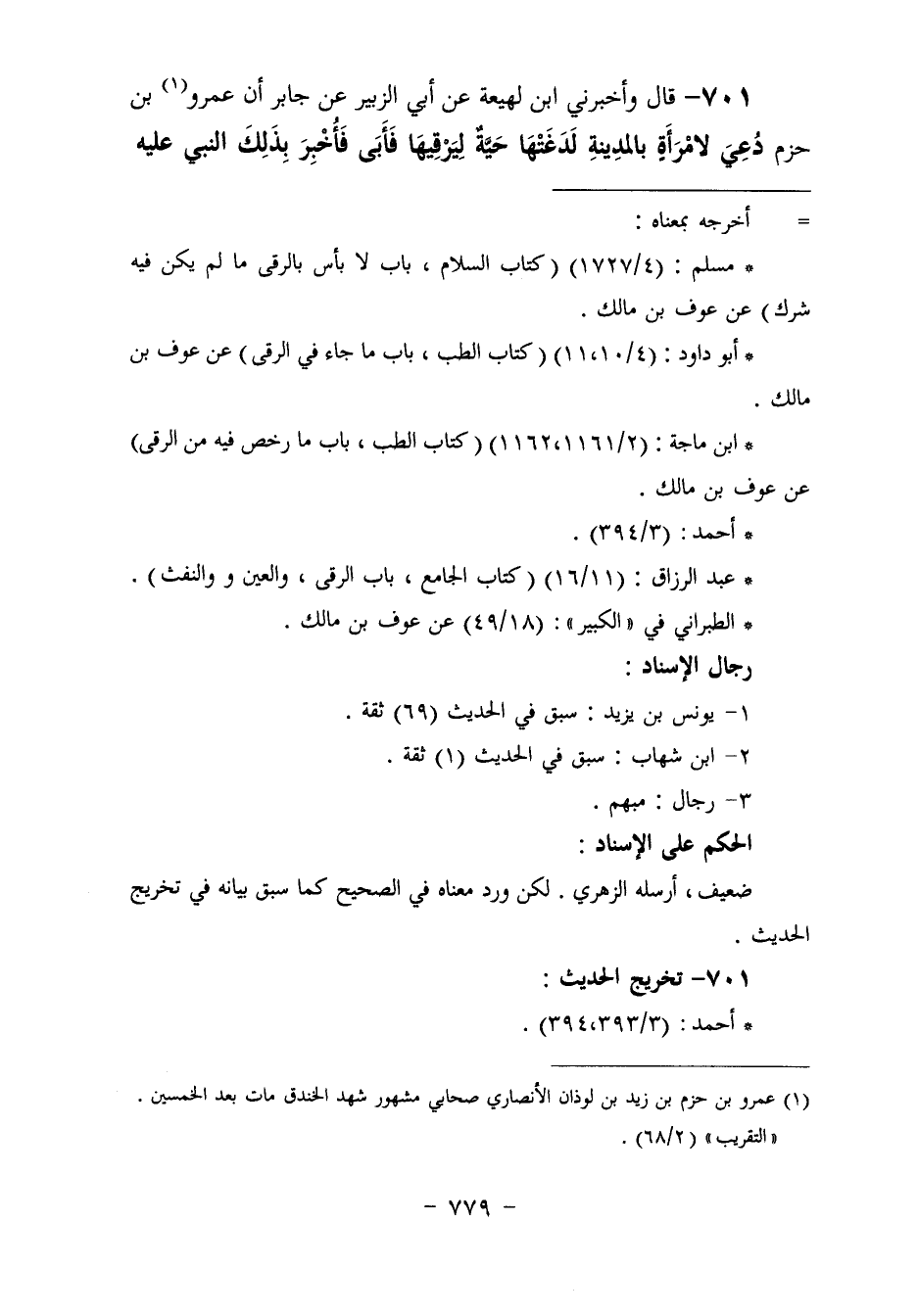 701 - وَأَخْبَرَنِي ابْنُ لَهِيعَةَ، عَنْ أَبِي الزُّبَيْرِ، عَنْ جَابِرٍ، أَنَّ عَمْرَو بْنَ حَزْمٍ، دُعِيَ لِامْرَأَةٍ بِالْمَدِينَةِ لَدَغَتْهَا حَيَّةٌ لَيَرْقِيَهَا، فَأَبَى، فَأُخْبِرَ بِذَلِكَ النَّبِيُّ , عَلَيْهِ -[780]- السَّلَامُ , فَدَعَاهُ، فَقَالَ عَمْرٌو: إِنَّكَ تَزْجُرُ عَنِ الرُّقَى، فَقَالَ رَسُولُ اللَّهِ عَلَيْهِ السَّلَامُ: «اقْرَأْهَا عَلَيَّ» ، فَقَرَأَهَا عَلَيْهِ، فَقَالَ: «§لَا بَأْسَ بِهَا، إِنَّمَا هِيَ مَوَاثِيقُ، فَارْقِ بِهَا»