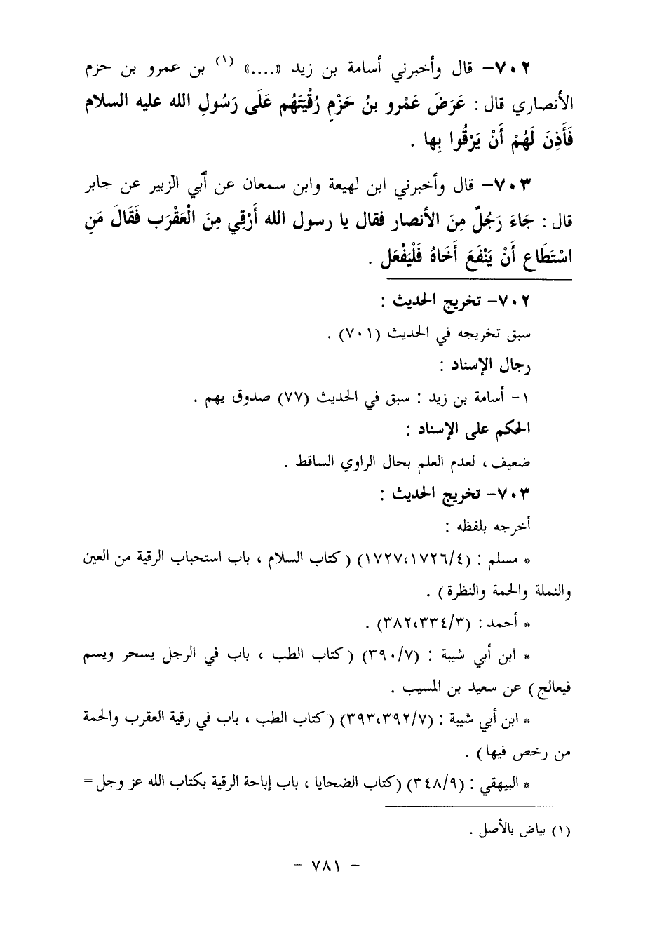 702 - وَأَخْبَرَنِي أُسَامَةُ بْنُ زَيْدِ بْنُ عَمْرَو بْنِ حَزْمٍ الْأَنْصَارِي، قَالَ: «§عَرَضَ عَمْرُو بْنُ حَزْمٍ رُقْيَتَهُمْ عَلَى رَسُولِ اللَّهِ عَلَيْهِ السَّلَامُ , فَأَذِنَ لَهُمْ أَنْ يَرْقُوا بِهَا»
