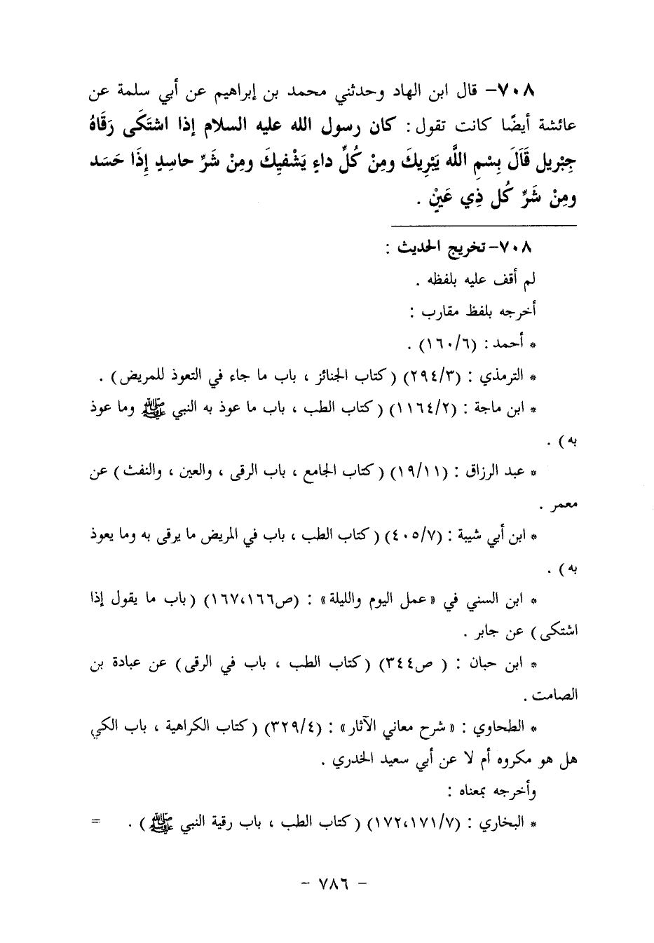 708 - قَالَ ابْنُ الْهَادِ: وَحَدَّثَنِي مُحَمَّدُ بْنُ إِبْرَاهِيمَ، عَنْ أَبِي سَلَمَةَ، عَنْ عَائِشَةَ، أَيْضًا، كَانَتْ تَقُولُ: كَانَ رَسُولُ اللَّهِ عَلَيْهِ السَّلَامُ , إِذَا اشْتَكَى رَقَاهُ جِبْرِيلُ، قَالَ: «§بِسْمِ اللَّهِ يُبْرِيكَ، وَمِنْ كُلِّ دَاءٍ يَشْفِيكَ، وَمِنْ شَرِّ حَاسِدٍ إِذَا حَسَدَ، وَمِنْ شَرِّ كُلِّ ذِي عَيْنٍ»