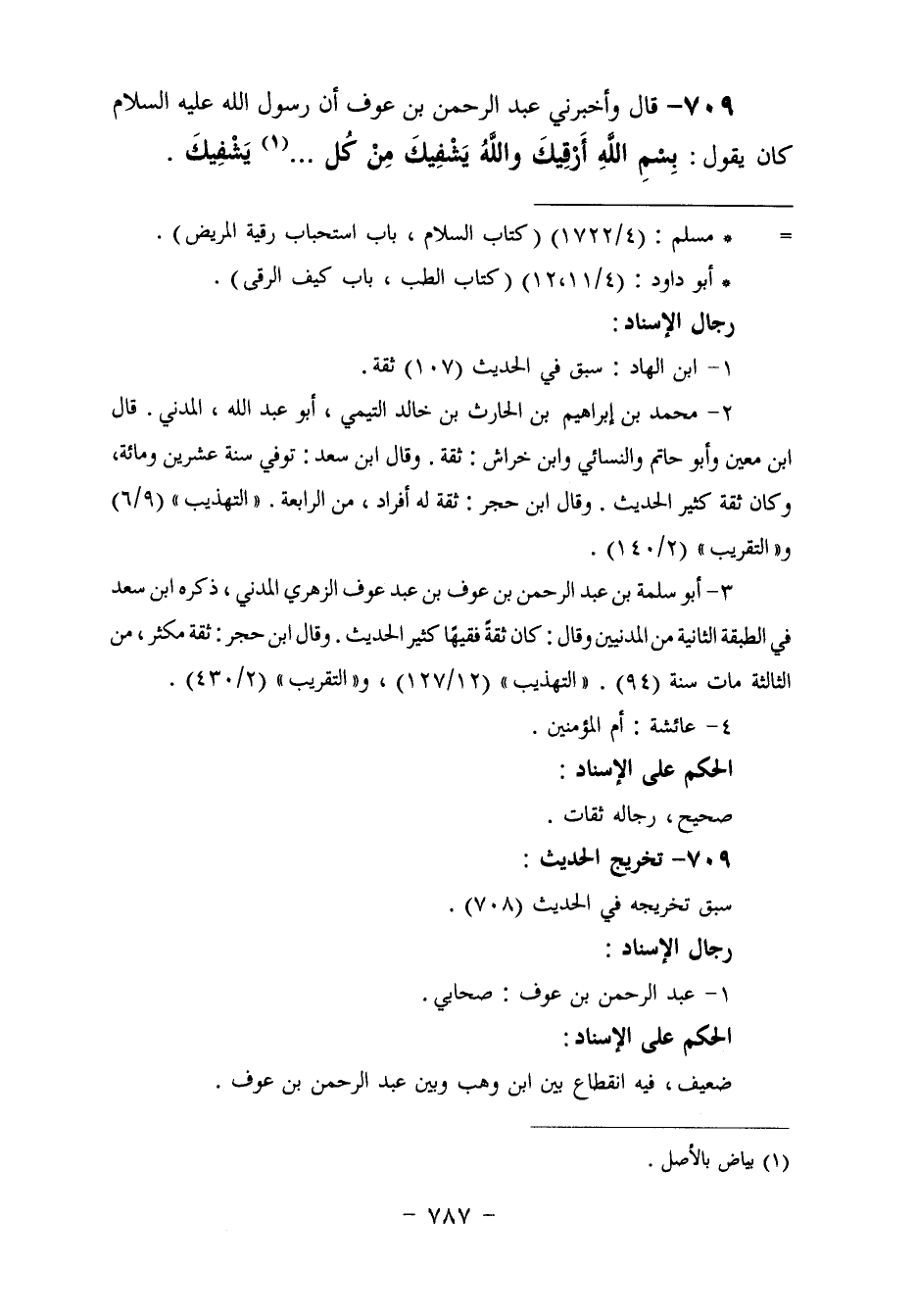 709 - وَأَخْبَرَنِي عَبْدُ الرَّحْمَنِ بْنُ عَوْفٍ، أَنَّ رَسُولَ اللَّهِ عَلَيْهِ السَّلَامُ , كَانَ يَقُولُ: «§بِسْمِ اللَّهِ أَرْقِيكَ وَاللَّهُ يَشْفِيكَ مِنْ كُلِّ. . . . يَشْفِيكَ» -[788]-