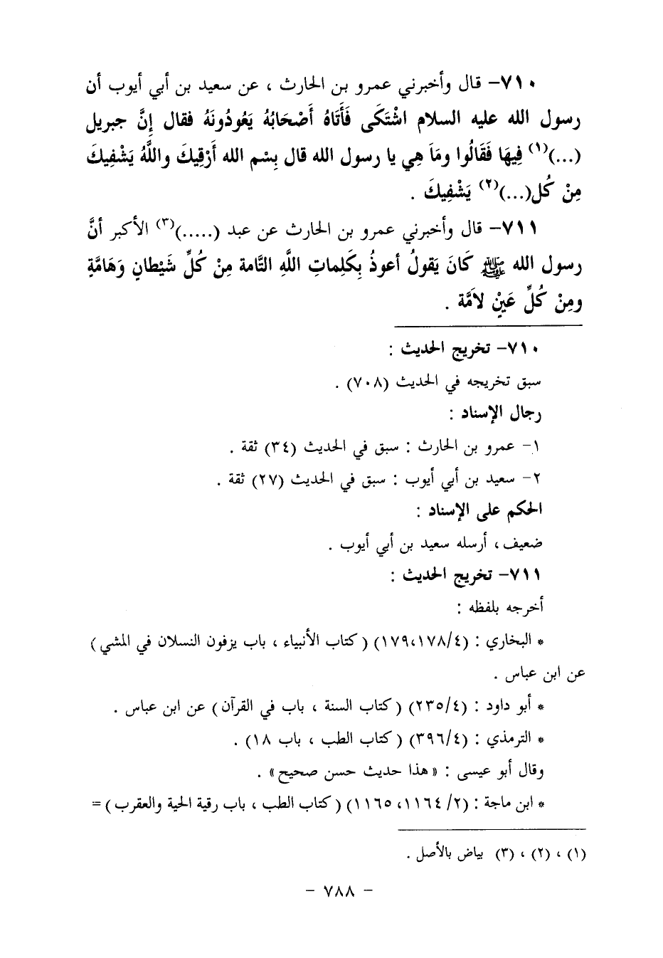 711 - وَأَخْبَرَنِي عَمْرُو بْنُ الْحَارِثِ، عَنْ عَبْدِ. . . . الْأَكْبَرِ، أَنَّ رَسُولَ اللَّهِ صَلَّى اللهُ عَلَيْهِ وَسَلَّمَ كَانَ يَقُولُ: «§أَعُوذُ بِكَلِمَاتِ اللَّهِ التَّامَّةِ مِنْ كُلِّ شَيْطَانٍ وَهَامَّةٍ، وَمِنْ كُلِّ عَيْنٍ لَامَّةٍ»