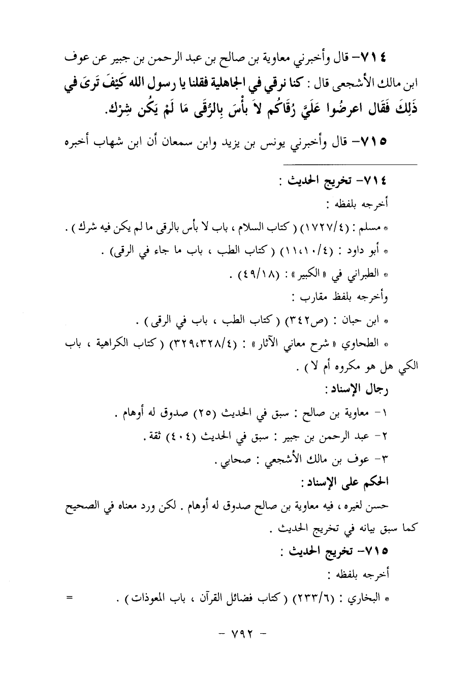 714 - وَأَخْبَرَنِي مُعَاوِيَةُ بْنُ صَالِحِ، عَنْ عَبْدِ الرَّحْمَنِ بْنِ جُبَيْرٍ، عَنْ عَوْفِ بْنِ مَالِكٍ الْأَشْجَعِيِّ، قَالَ: كُنَّا نَرْقِي فِي الْجَاهِلِيَّةِ، فَقُلْنَا: يَا رَسُولَ اللَّهِ , كَيْفَ تَرَى فِي ذَلِكَ؟ فَقَالَ: «§اعْرِضُوا عَلَيَّ رُقَاكُمْ، لَا بَأْسَ بِالرُّقَى مَا لَمْ يَكُنْ فِيهِ شِرْكٌ»