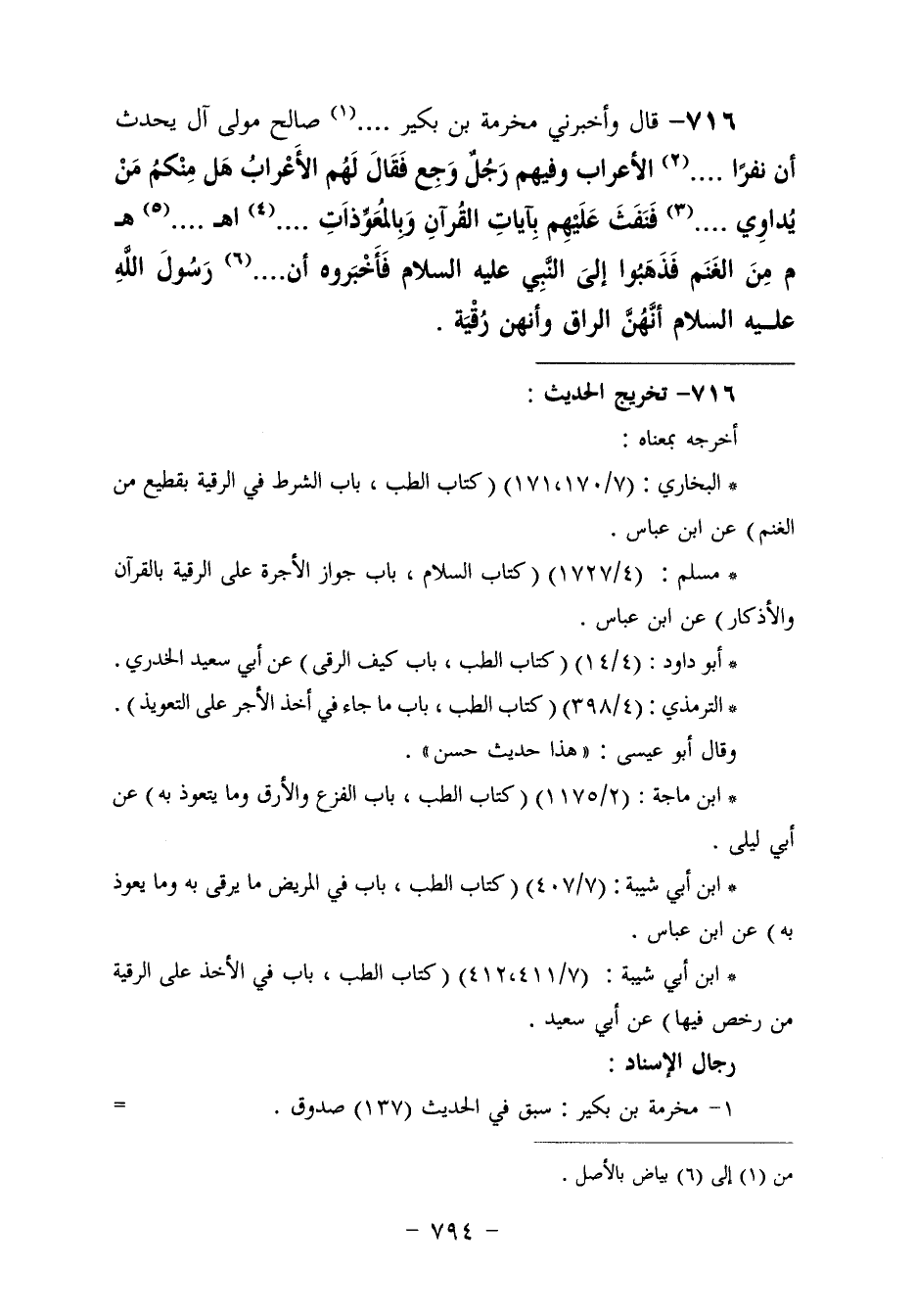 716 - وَأَخْبَرَنِي مَخْرَمَةُ بْنُ بُكَيْرٍ. . . . .، صَالِحٌ مَوْلَى آلِ. . . . يُحَدِّثُ، أَنَّ نَفَرًا مِنَ الْأَعْرَابِ، وَفِيهِمْ رَجُلٌ وَجِعٌ، فَقَالَ لَهُمُ الْأَعْرَابُ: هَلْ مِنْكُمْ مَنْ يُدَاوِي، فَنَفَثَ عَلَيْهِمْ بِآيَاتِ الْقُرْآنِ وَبِالْمُعَوِّذَاتِ مِنَ الْغَنَمِ، فَذَهَبُوا إِلَى النَّبِيِّ عَلَيْهِ السَّلَامُ فَأَخْبَرُوهُ أَنَّ رَسُولَ اللَّهِ عَلَيْهِ السَّلَامُ «أَنَّهُنَّ الرَّاقُ، §وَأَنَّهُنَّ رُقْيَةٌ» -[795]- قَالَ: