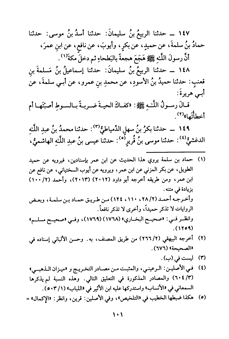 148 - حدثنا الربيع بن سليمان حدثنا إسماعيل بن مسلمة بن قعنب حدثنا حُمَيْدُ بْنُ الأَسْوَدِ عَنْ مُحَمَّدِ بْنِ عَمْرٍو عَنْ أَبِي سَلَمَةَ عَنْ أَبِي هُرَيْرَةَ قَالَ رَسُولُ اللَّهِ صَلَّى اللَّهُ عَلَيْهِ وَسَلَّمَ كَفَاكَ الْحَيَّةَ ضَرْبَةٌ بِالسَّوْطِ أَصَبْتَهَا أَمْ أَخْطَأْتَهَا.