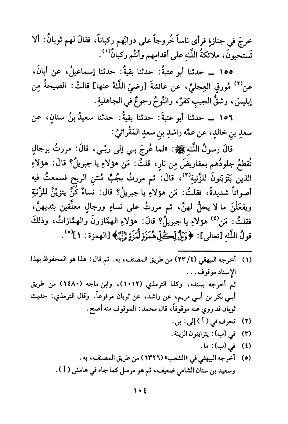 156 - حدثنا أبوعتبة حدثنا بقية حدثنا سَعِيدُ بْنُ سِنَانٍ عَنْ سَعْدِ بْنِ خَالِدٍ عَنْ عَمِّهِ رَاشِدِ بْنِ سَعْدٍ المَقْرائي قَالَ رَسُولُ اللَّهِ صَلَّى اللَّهُ عَلَيْهِ وَسَلَّمَ لَمَّا عُرِجَ بِي إِلَى رَبِّي قَالَ مَرَرْتُ بِرِجَالٍ تُقَطَّعُ جُلُودُهُمْ بِمَقَارِيضَ مِنْ نَارٍ قُلْتُ مَنْ هَؤُلاءِ يَا جِبْرِيلُ قَالَ هَؤُلاءِ الَّذِينَ يتزينون للزّنيَةِ قَالَ ثُمَّ مَرَرْتُ بِجُبٍّ مُنْتِنِ الرِّيحِ فَسَمِعْتُ فِيهِ أَصْوَاتًا شَدِيدَةً فَقُلْتُ مَنْ هَؤُلاءِ يَا جبريل قال نساء كُنَّ يتزين للزّنيَةِ وَيَفْعَلْنَ مَا لا يَحِلُّ لَهُنُّ ثُمَّ مَرَرْتُ عَلَى نِسَاءٍ وَرِجَالٍ مُعَلَّقِينَ بِثَدْيِهِنَّ فَقُلْتُ مَا هَؤُلاءِ يَا جِبْرِيلُ قَالَ هَؤُلاءِ الْهَمَّازُونَ وَالْهَمَّازَاتُ وذلك قول الله [تعالى] {ويل لكل همزة لمزة}.