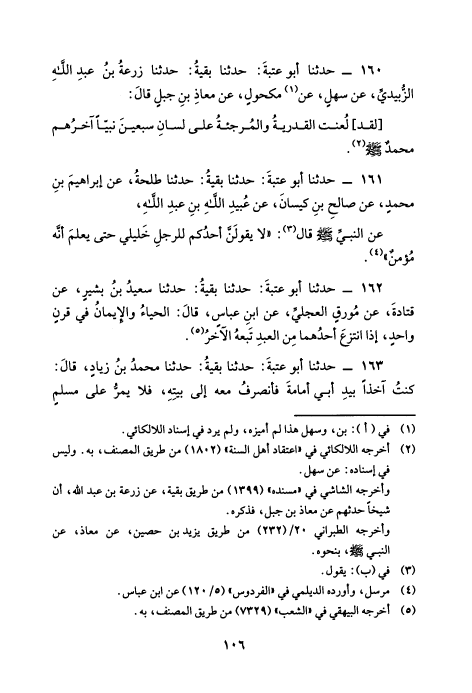 161 - حدثنا أبوعتبة حدثنا بقية حدثنا طلحة عن إبراهيم بن محمد عَنْ صَالِحِ بْنِ كَيْسَانَ عَنْ عُبَيْدِ اللَّهِ بْنِ عَبْدِ اللَّهِ عَنِ النَّبِيِّ صَلَّى اللَّهُ عَلَيْهِ وَسَلَّمَ قَالَ لا يقولن أحدكم للرجل خليلي حتى يعلم أنه مؤمن.