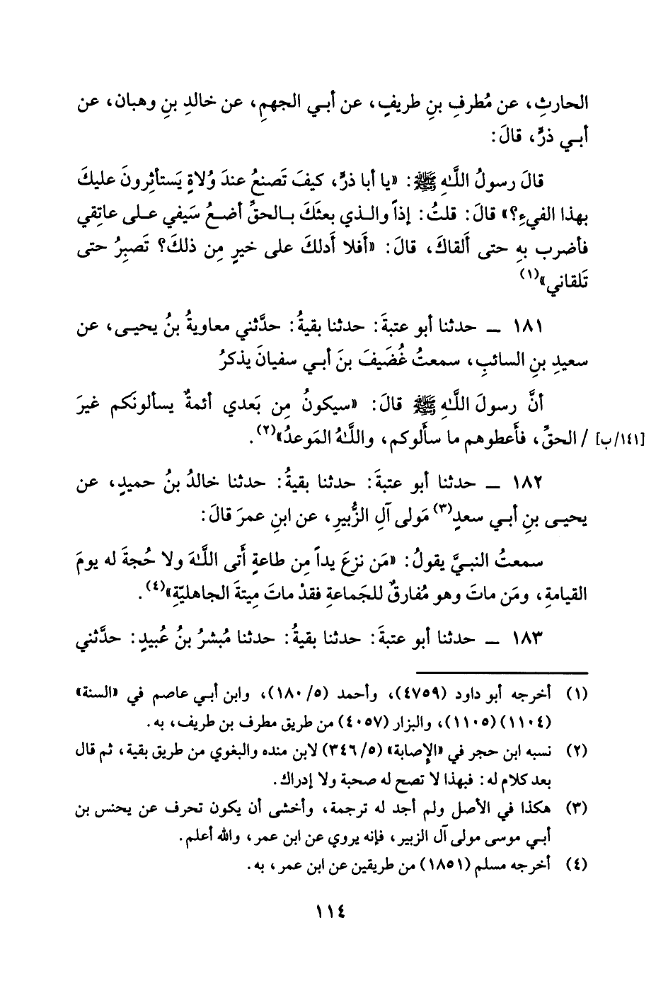 181 - حدثنا أبوعتبة حدثنا بَقِيَّةُ حَدَّثَنِي مُعَاوِيَةُ بْنُ يَحْيَى عَنْ سَعِيدِ بن السائب سمعت غصيف بن أبي سفيان يَذْكُرُ