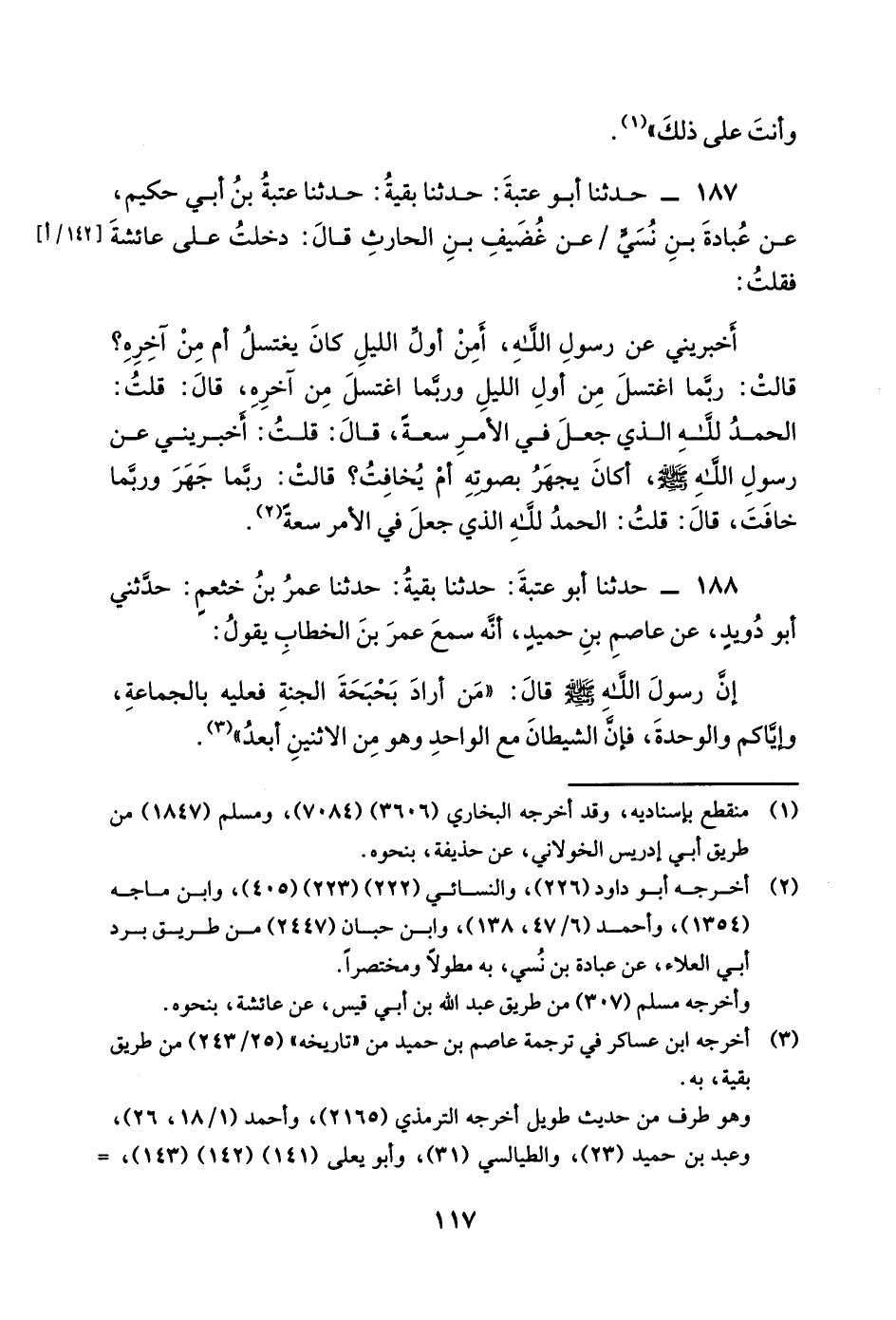 187 - حدثنا أبوعتبة حدثنا بقية حدثنا عُتْبَةُ بْنُ أَبِي حَكِيمٍ عَنْ عُبَادَةَ بْنِ نُسَيٍّ / عَنْ غُضَيْفِ بْنِ الْحَارِثِ قَالَ دَخَلْتُ عَلَى عَائِشَةَ فَقُلْتُ
