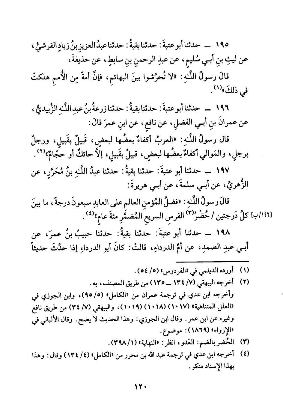 196 - حدثنا أبوعتبة حدثنا بقية حدثنا زُرْعَةُ بْنُ عَبْدِ اللَّهِ الزُّبَيْدِيُّ عَنْ عِمْرَانَ بْنِ أَبِي الْفَضْلِ عَنْ نَافِعٍ عَنِ ابْنِ عُمَرَ قَالَ