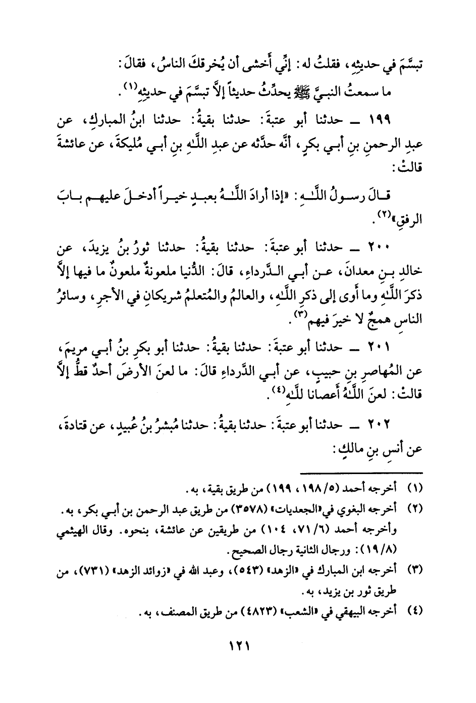 201 - حدثنا أبوعتبة حدثنا بقية حدثنا أبوبكر بن أبي مريم عن المهاصر بْنِ حَبِيبٍ عَنْ أَبِي الدَّرْدَاءِ قَالَ مَا لَعَنَ الأَرْضَ أَحَدٌ قَطُّ إِلا قَالَتْ لَعَنَ الله أعصانا لله.