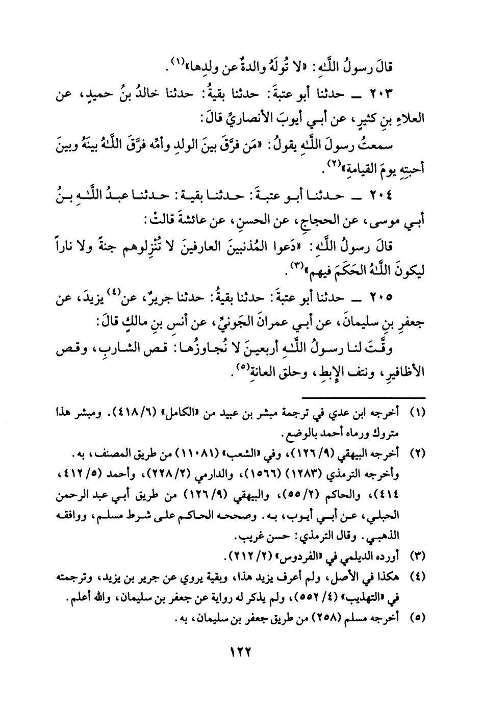 205 - حدثنا أبوعتبة حدثنا بقية حدثنا جَرِيرٌ عَنْ يَزِيدَ عَنْ جَعْفَرِ بْنِ سُلَيْمَانَ عَنْ أَبِي عِمْرَانَ الْجَوْنِيِّ عَنْ أَنَسِ بْنِ مَالِكٍ قَالَ