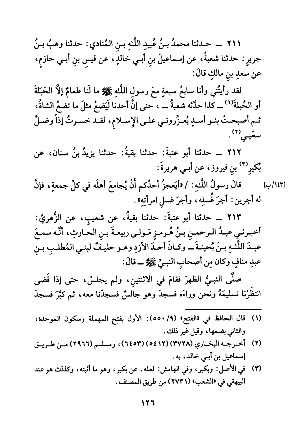 213 - حدثنا أبوعتبة حدثنا بَقِيَّةُ عَنْ شُعَيْبٍ عَنِ الزُّهْرِيِّ أَخْبَرَنِي عَبْدُ الرَّحْمَنِ بْنُ هُرْمُزٍ مَوْلَى رَبِيعَةَ بْنِ الْحَارِثِ أَنَّهُ سَمِعَ عَبْدَ اللَّهِ بْنَ بُحينة وَكَانَ أحد الأزد وهو حليف لبني المطلب بن عبدمناف وَكَانَ مِنْ أَصْحَابِ النَّبِيِّ صَلَّى اللَّهُ عَلَيْهِ وَسَلَّمَ قَالَ