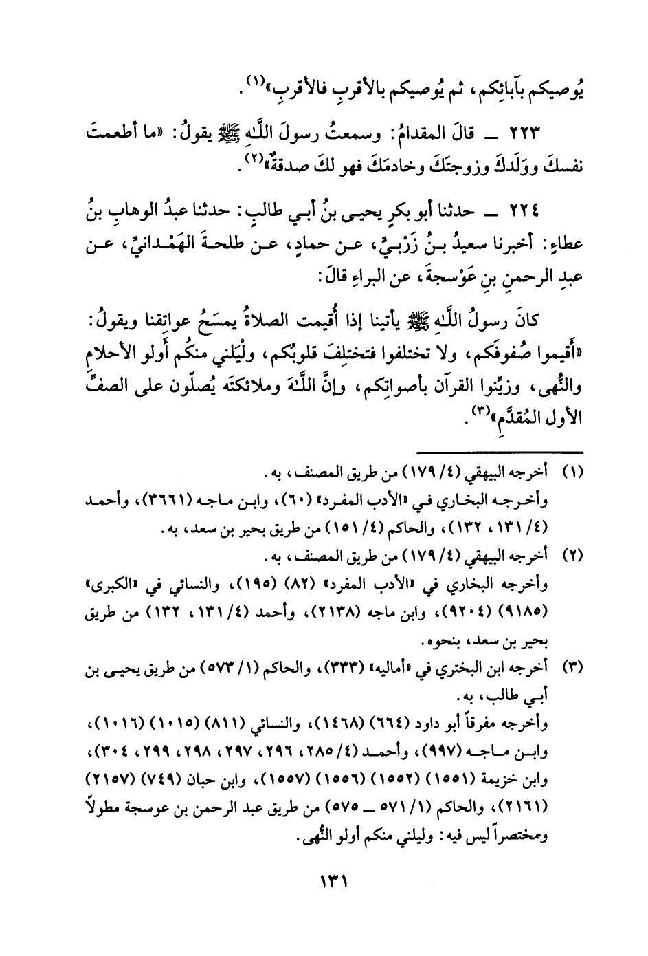 224 - حدثنا أبوبكر يحيى بن أبي طالب حدثنا عبد الوهاب بن عطاء أخبرنا سَعِيدُ بْنُ زَرْبيِّ عَنْ حَمَّادٍ عَنْ طَلْحَةَ الهَمْداني عَنْ عَبْدِ الرَّحْمَنِ بْنِ عَوْسَجَةَ عَنِ الْبَرَاءِ قَالَ