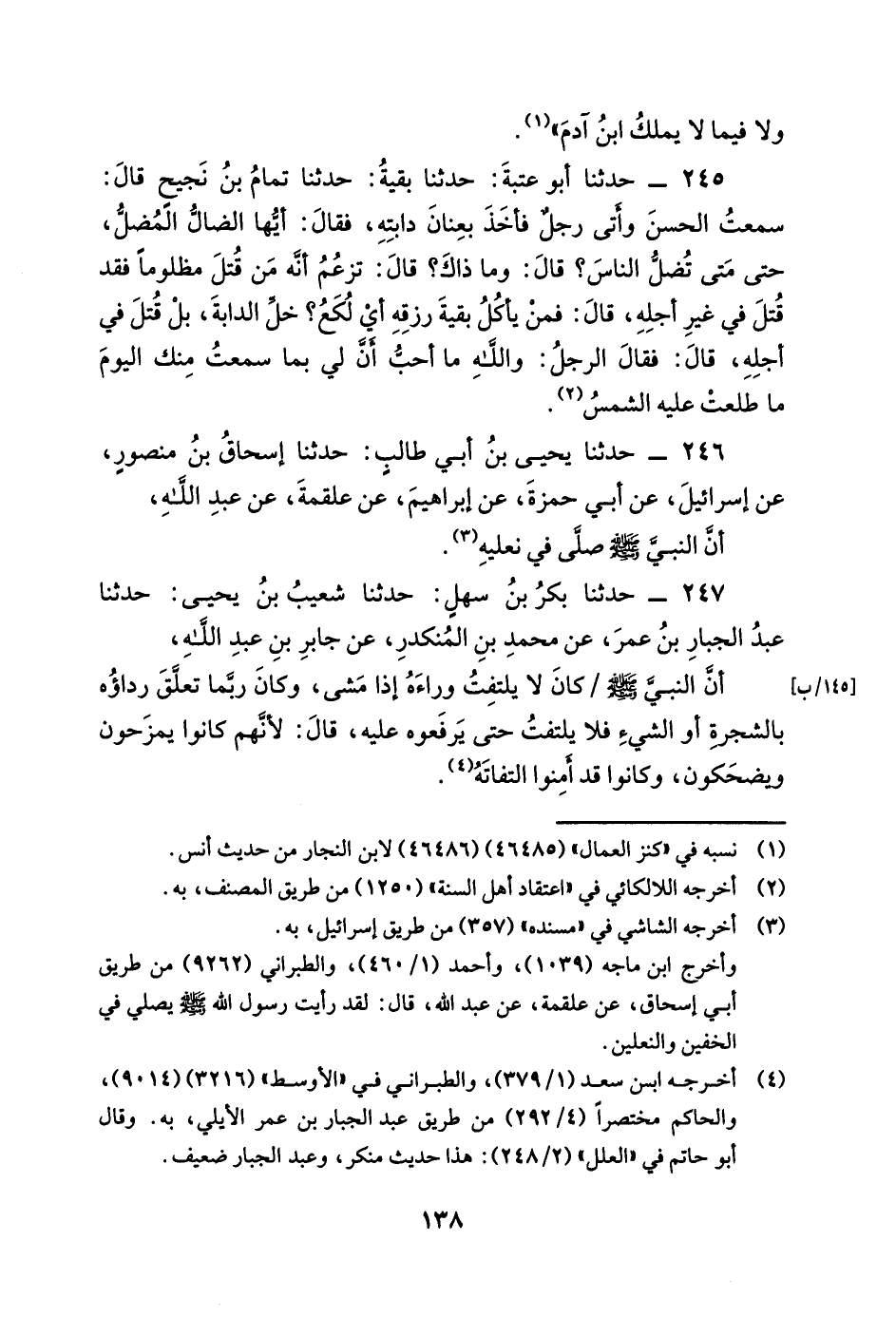 245 - حدثنا أبوعتبة حدثنا بقية حدثنا تمام بن نَجيح قال سمعت الحسن وأتى رجل فَأَخَذَ بِعِنَانِ دَابَّتِهِ فَقَالَ أَيُّهَا الضَّالُّ الْمُضِلُّ حتى متى تضل الناس قال وماذاك قَالَ تَزْعُمُ أَنَّهُ مَنْ قُتِلَ مَظْلُومًا فَقَدْ قُتِلَ فِي غَيْرِ أَجَلِهِ قَالَ فَمَنْ يَأْكُلُ بَقِيَّةَ رِزْقِهِ أَيْ لُكَع خلِّ الدابةَ بل قُتِلَ فِي أَجَلِهِ قَالَ فَقَالَ الرَّجُلُ وَاللَّهِ مَا أُحِبُّ أَنَّ لِيَ بِمَا سَمِعْتُ مِنْكَ الْيَوْمَ مَا طَلَعَتْ عَلَيْهِ الشَّمْسُ.