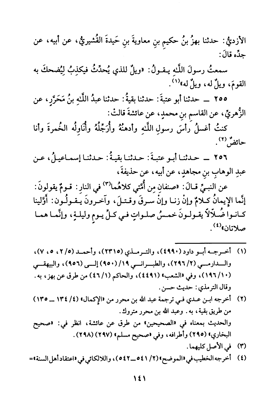 255 - حدثنا أبوعتبة حدثنا بقية حدثنا عبد الله بن مُحَرَّر عَنِ الزُّهْرِيِّ عَنِ الْقَاسِمِ بْنِ مُحَمَّدٍ عَنْ عَائِشَةَ قَالَتْ