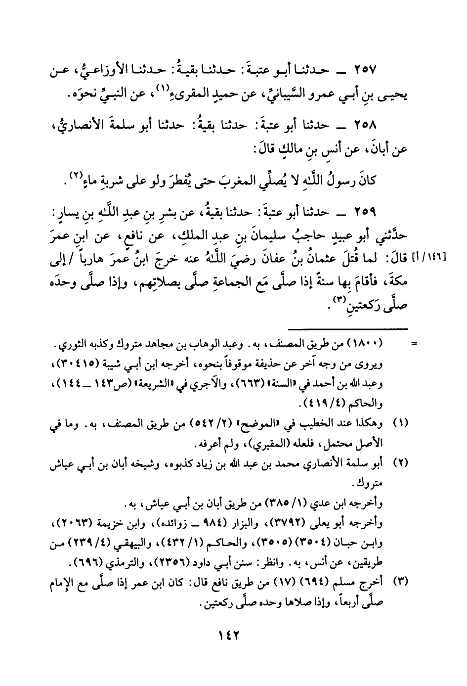 259 - حدثنا أبوعتبة حدثنا بَقِيَّةُ عَنْ بِشْرِ بْنِ عَبْدِ اللَّهِ بْنِ يسار حدثني أبوعبيد حاجب سُلَيْمَانَ بْنِ عَبْدِ الْمَلِكِ عَنْ نَافِعٍ عَنِ ابْنِ عُمَرَ قَالَ لَمَّا قُتِلَ عُثْمَانُ بْنُ عَفَّانَ رَضِيَ اللَّهُ عَنْهُ خَرَجَ ابْنُ عُمَرَ هَارِبًا /إِلَى مَكَّةَ فَأَقَامَ بِهَا سَنَةً إِذَا صلَّى مع الجماعة صلى بِصَلاتِهِمْ وَإِذَا صَلَّى وَحْدَهُ صَلَّى رَكْعَتَيْنِ.