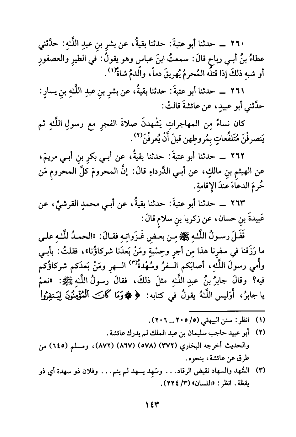 261 - حدثنا أبوعتبة حدثنا بَقِيَّةُ عَنْ بِشْرِ بْنِ عَبْدِ اللَّهِ بْنِ يسار حدثني أبوعبيد عَنْ عَائِشَةَ قَالَتْ