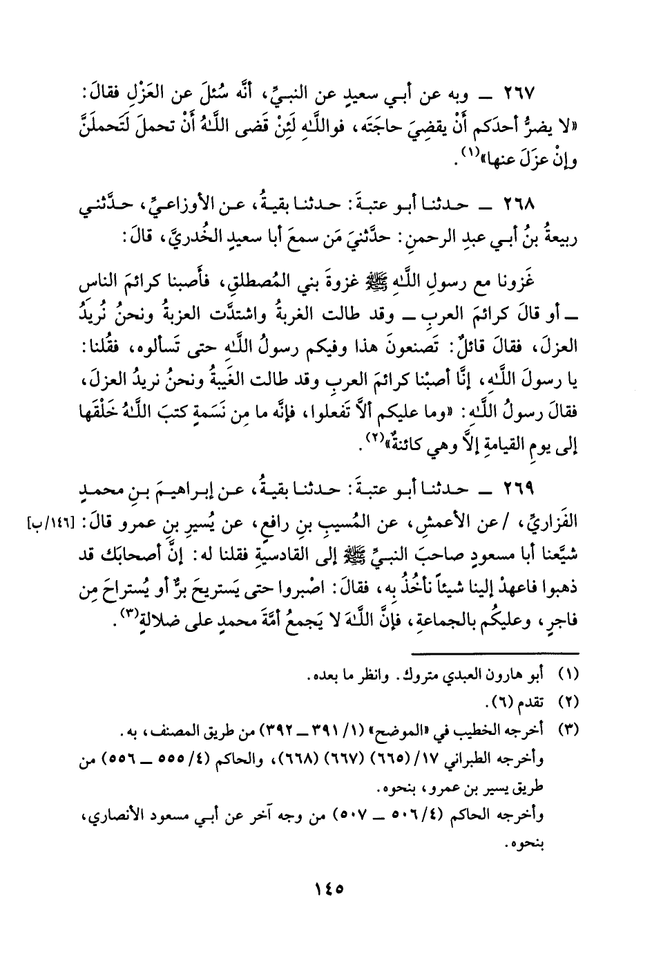 267 - وَبِهِ عَنْ أَبِي سَعِيدٍ عَنِ النَّبِيِّ أَنَّهُ سُئِلَ عَنِ الْعَزْلِ فَقَالَ لا يَضُرُّ أَحَدَكُمْ أَنْ يَقْضِيَ حَاجَتَهُ فَوَاللَّهِ لَئِنْ قَضَى اللَّهُ أَنْ تَحْمِلَ لَتَحْمِلَنَّ وَإِنْ عَزَلَ عَنْهَا.