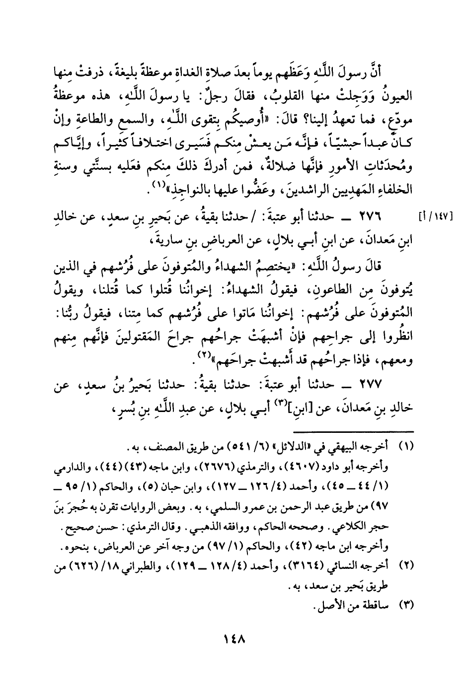 276 - حَدَّثَنَا أَبُو عُتْبَةَ / حَدَّثَنَا بَقِيَّةُ عَنْ بَحير بن سعد عن خالد بن معدان عن ابن أبي بلال عَنِ الْعِرْبَاضِ بْنِ سَارِيَةَ