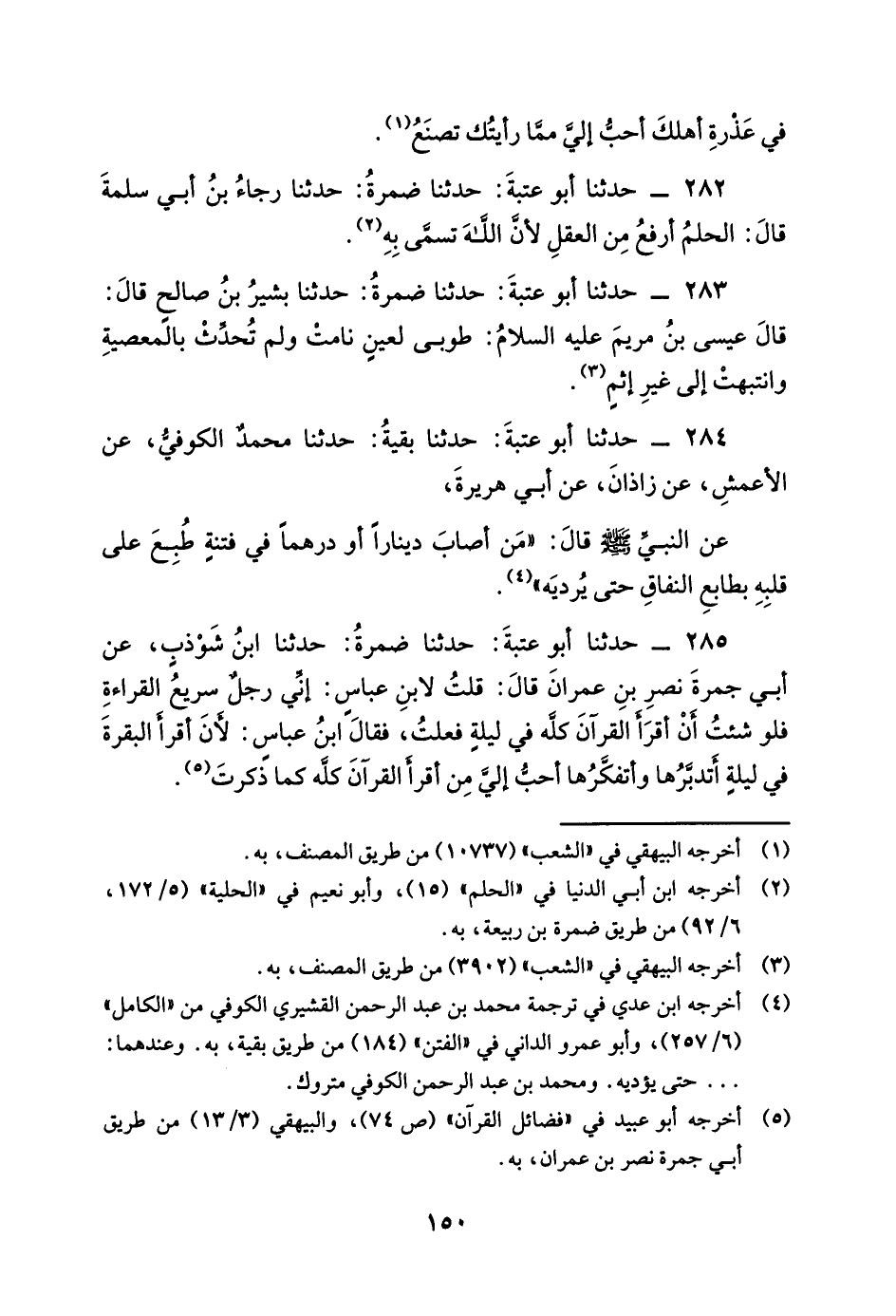 282 - حدثنا أبوعتبة حدثنا ضمرة حدثنا رَجَاءُ بْنُ أَبِي سَلَمَةَ قَالَ الْحِلْمُ أرْفَعُ من العقل لأن الله تسمى به.