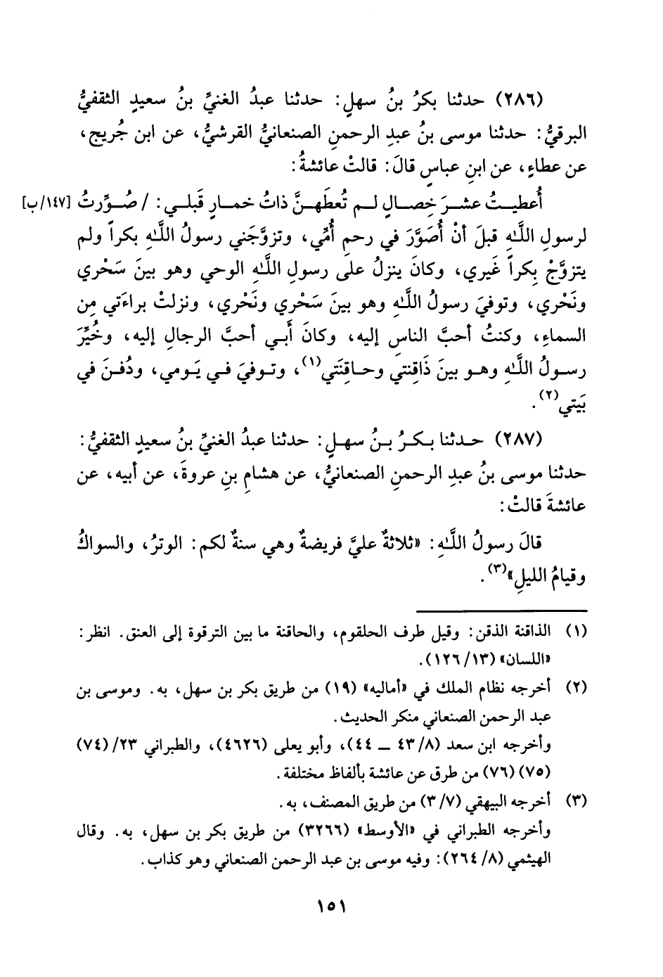 287 - حدثنا بكر بن سهل حدثنا عبد الغني بن سعيد الثقفي حدثنا مُوسَى بْنُ عَبْدِ الرَّحْمَنِ الصَّنْعَانِيُّ عَنْ هِشَامِ بْنِ عُرْوَةَ عَنْ أَبِيهِ عَنْ عَائِشَةَ قَالَتْ