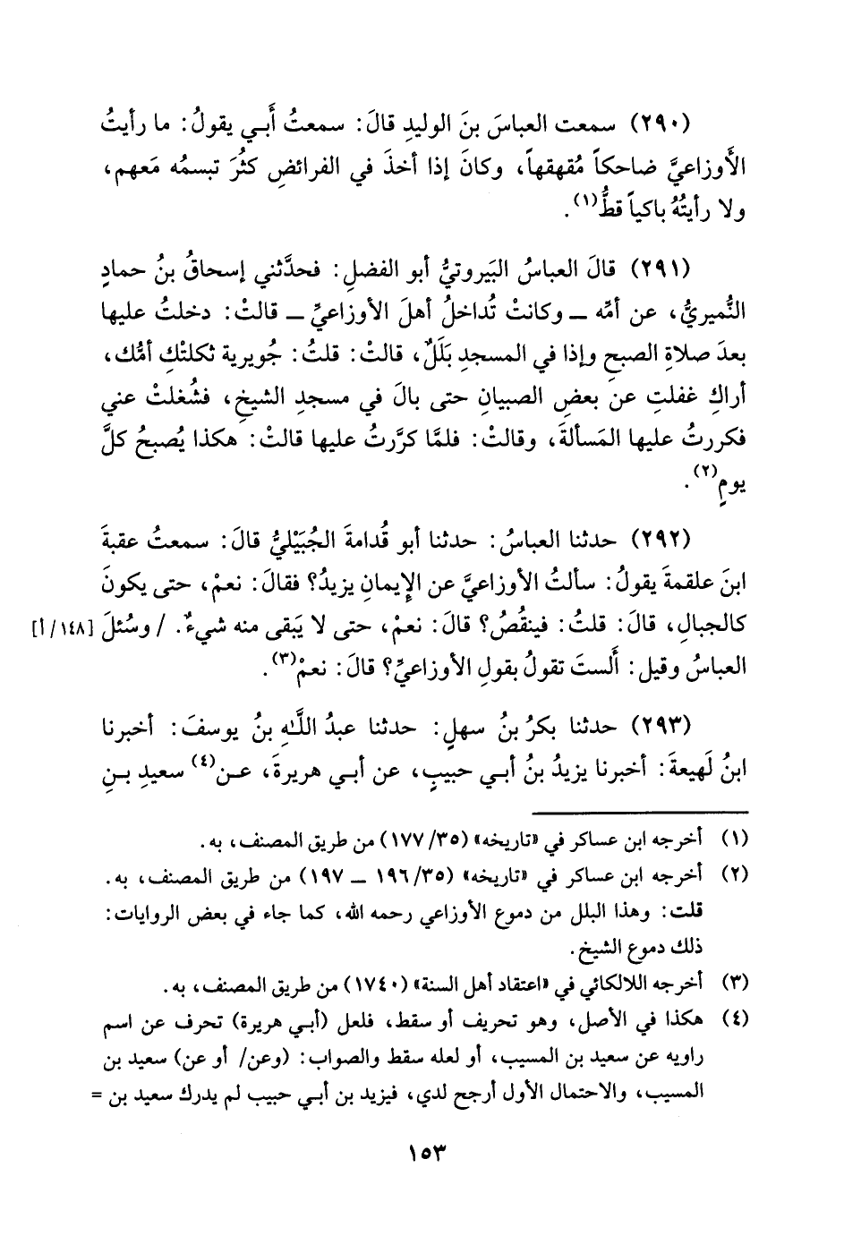 290 - سَمِعْتُ الْعَبَّاسَ بْنَ الْوَلِيدِ قَالَ سَمِعْتُ أَبِي يَقُولُ مَا رَأَيْتُ الأَوْزَاعِيَّ ضَاحِكًا مُقَهْقِهًا وَكَانَ إِذَا أَخَذَ فِي الْفَرَائِضِ كَثُرَ تَبَسُّمُهُ مَعَهُمْ ولارأيته باكيا قط.