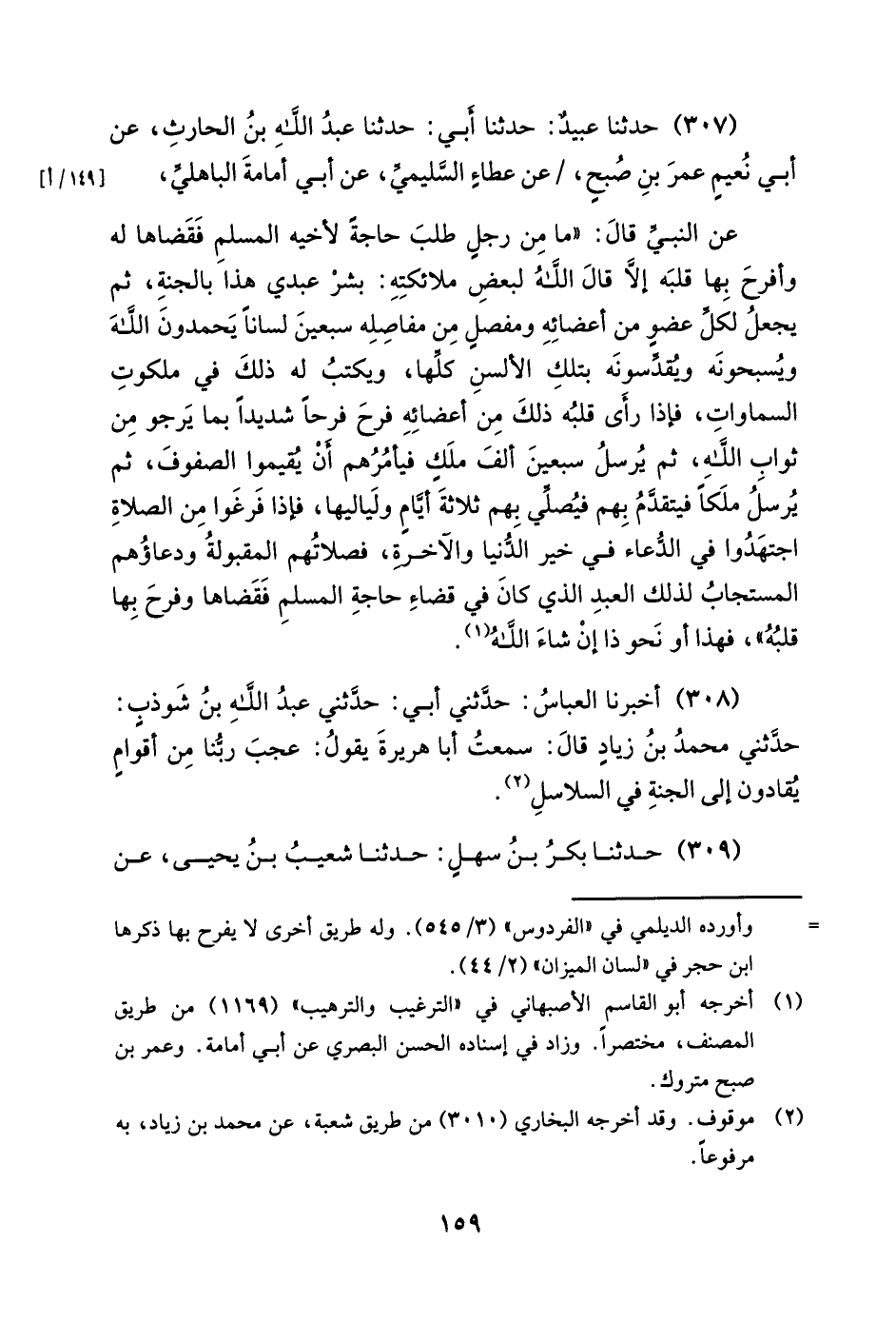 عَنِ النَّبِيِّ قَالَ مَا مِنْ رَجُلٍ طَلَبَ حَاجَةً لأَخِيهِ الْمُسْلِمِ فَقَضَاهَا لَهُ وَأَفْرَحَ بِهَا قَلْبَهُ إِلا قَالَ اللَّهُ لِبَعْضِ مَلائِكَتِهِ بَشِّرْ عَبْدِي هَذَا بِالْجَنَّةِ ثُمَّ يَجْعَلُ لِكُلِّ عُضْوٍ مِنْ أَعْضَائِهِ وَمَفْصِلٍ مِنْ مَفَاصِلِهِ سَبْعِينَ لِسَانًا يَحْمَدُونَ اللَّهَ وَيُسَبِّحُونَهُ وَيُقَدِّسُونَهُ بِتِلْكَ الأَلْسُنِ كُلِّهَا وَيُكْتَبُ لَهُ ذَلِكَ فِي مَلَكُوتِ السَّمَاوَاتِ فَإِذَا رَأَى قَلْبُهُ ذَلِكَ من أعضائه فرح فرحا شديدا بما يرجوا مِنْ ثَوَابِ اللَّهِ ثُمَّ يُرْسِلُ سَبْعِينَ أَلْفَ ملك فيأمرهم أن يقيموا الصفوف ثم يرسل ملكا فيتقدم بهم فَيُصَلِّي بِهِمْ ثَلاثَةَ أَيَّامٍ وَلَيَالِيهَا فَإِذَا فَرَغُوا من الصلاة اجتهدوا فِي الدُّعَاءِ فِي خَيْرِ الدُّنْيَا وَالآخِرَةِ فَصَلاتُهُمُ المقبولة ودعائهم الْمُسْتَجَابُ لِذَلِكَ الْعَبْدِ الَّذِي كَانَ فِي قَضَاءِ حاجة المسلم فقضاها وفرح بها قلبه فهذا أونحوذا إِنْ شَاءَ اللَّهُ.